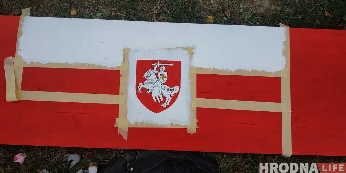 Лаўкі і агароджу пафарбавалі ў белы і чырвоны колеры, на стальніцы з дапамогай трафарэта намалявалі герб “Пагоня”. Сабралася чалавек 15, пачалі каля 12 дня і працавалі да 16-17 гадзін.
