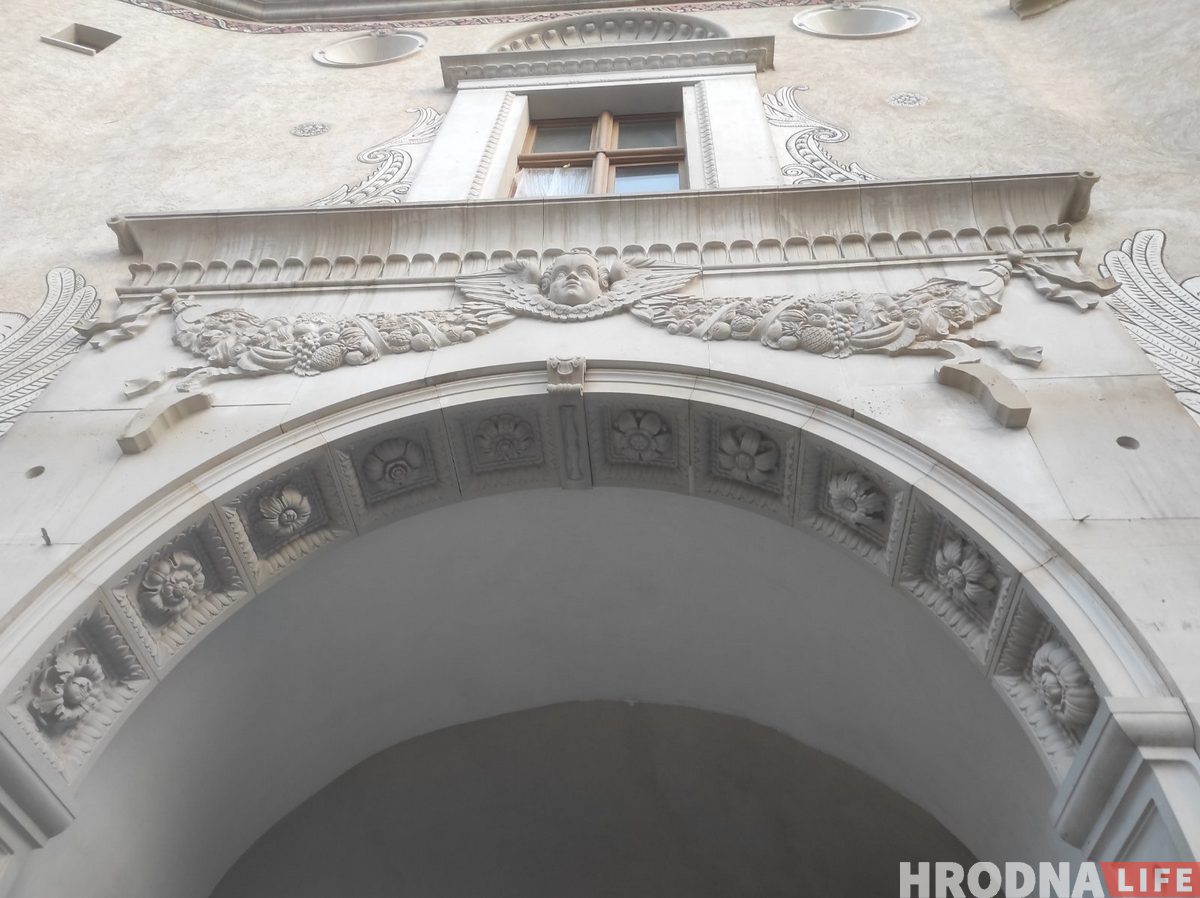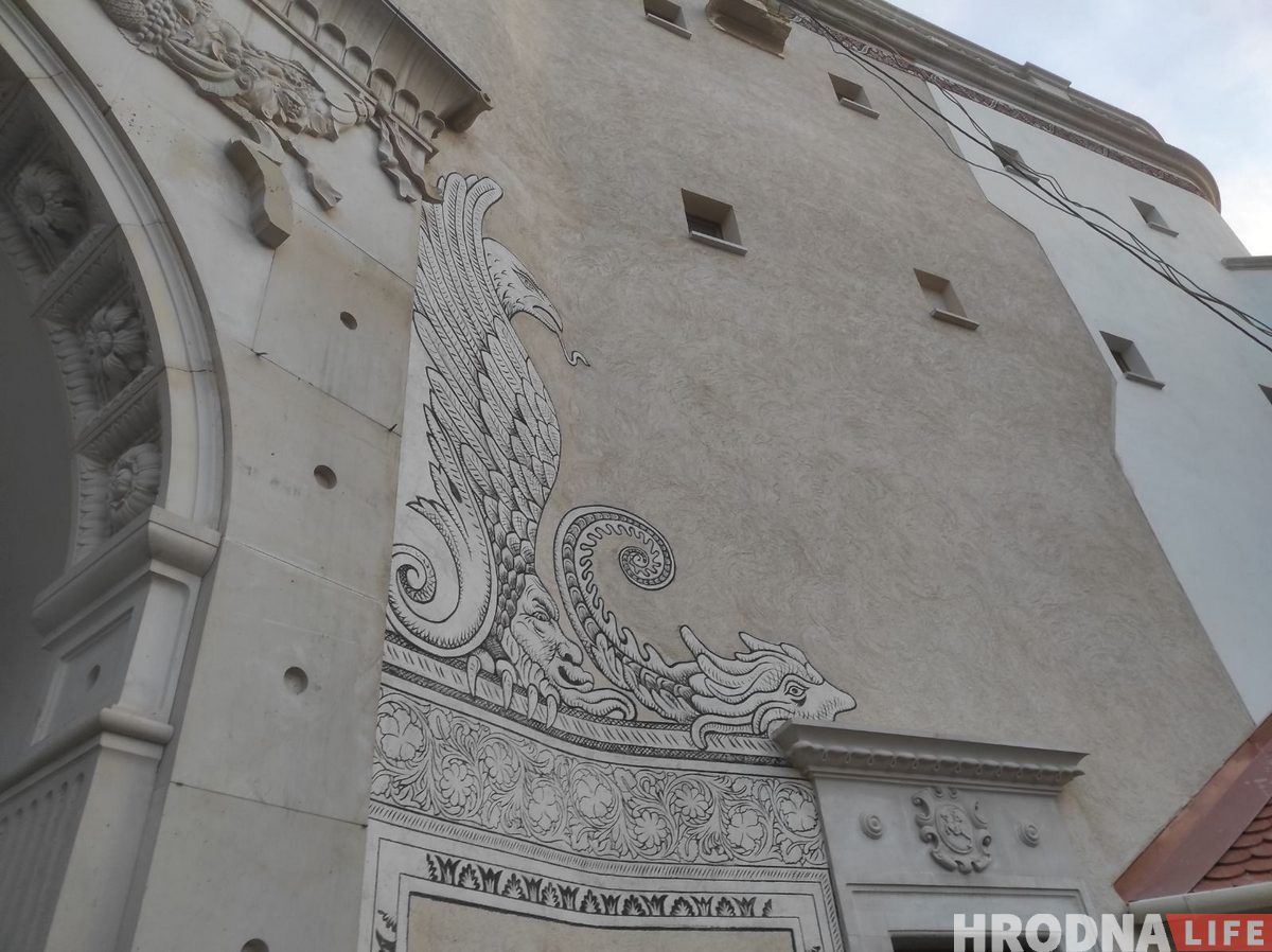 На ўваходнай браме з’явіўся аб’ёмны герб Рэчы Паспалітай з выявамі польскага арла і “Пагоні” Вялікага Княства Літоўскага. “Шмат было абмеркаванняў, у тым ліку і ў гэтай групе”, – удакладніла Алена Клімовіч у суполцы Facebook “Стары замак – Гродна”, прысвечанай рэканструкцыі замка.