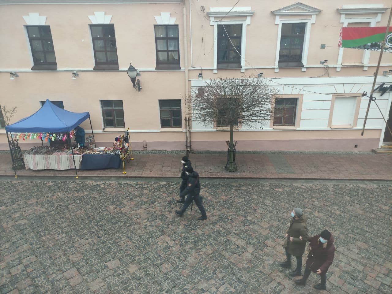 На вул.Кляцкова людзі, якія прадставіліся дружыннікамі, паклалі на зямлю хлопца з бел-чырвона-белым сцягам. Яго забрала міліцыя. Пазней “дружыннік” паказаў пасведчанне і прадставіўся супрацоўнікам міліцыі.