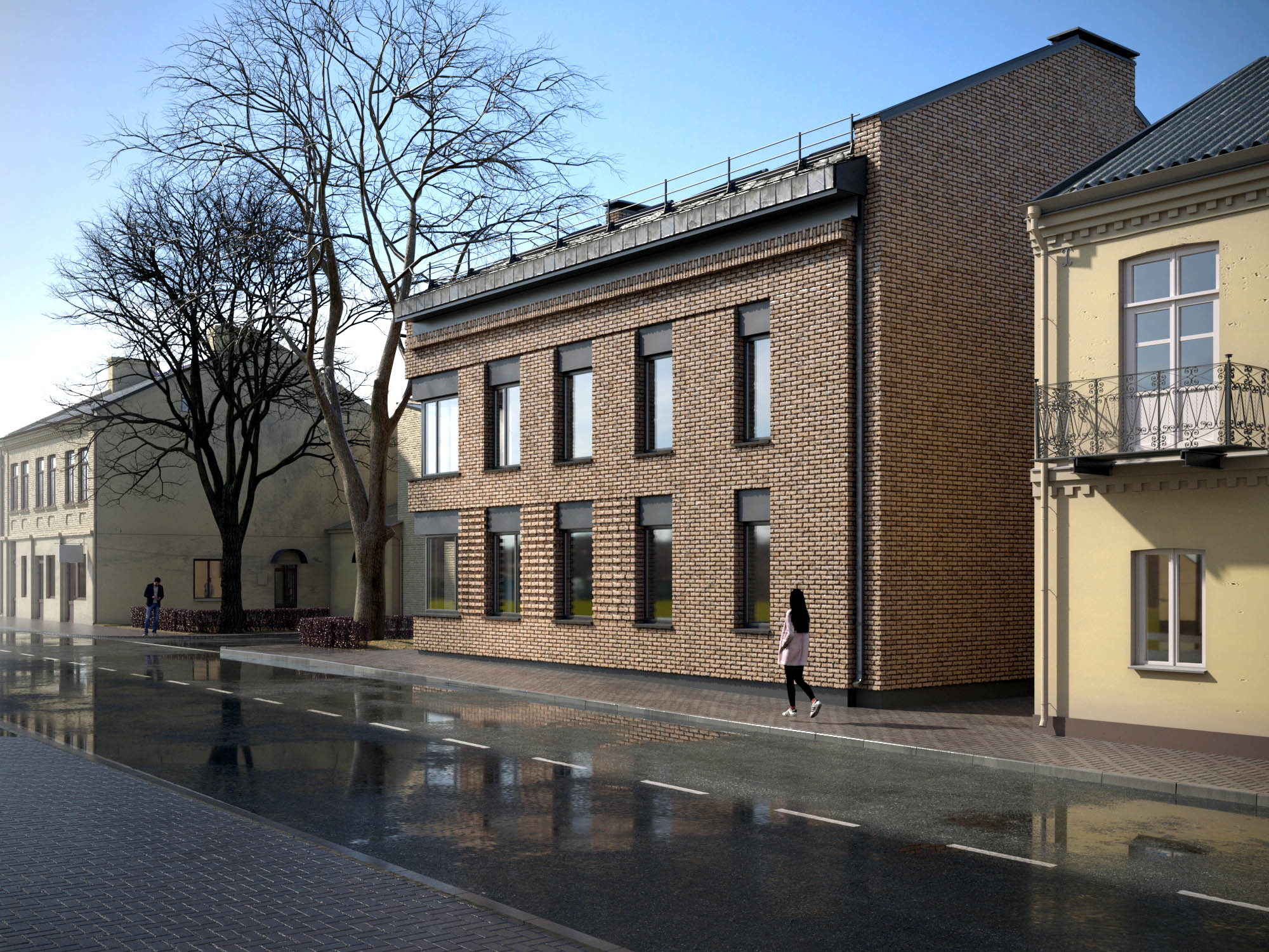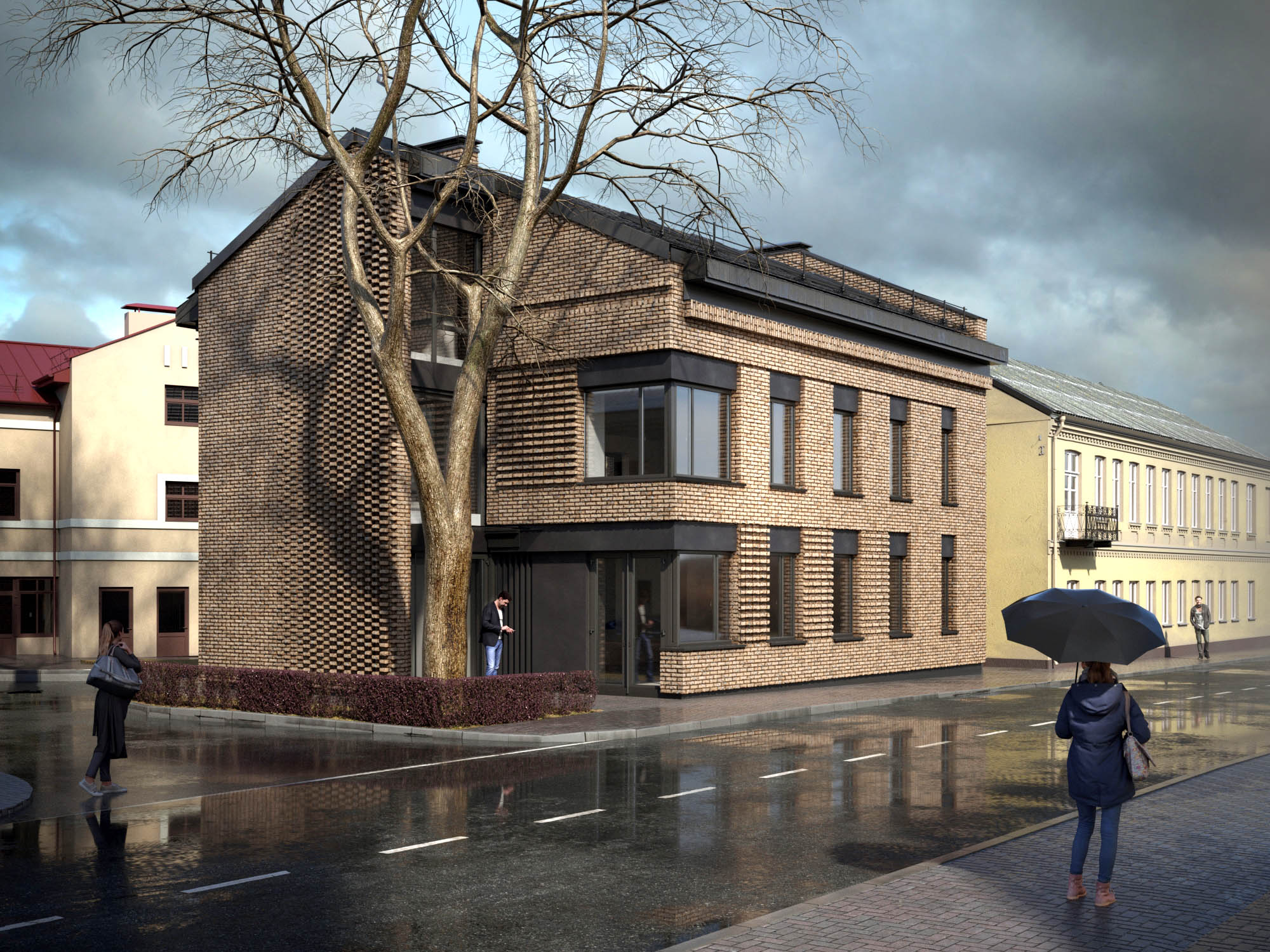 Постройка будет сделана из современных строительных материалов, но видом и объемом будет вписана в архитектуру улицы. В качестве основного фасадного материала используют кирпич. Оконные проемы и фасадные рольставни выполнят в разнообразных типоразмерах с наростающим ритмом.