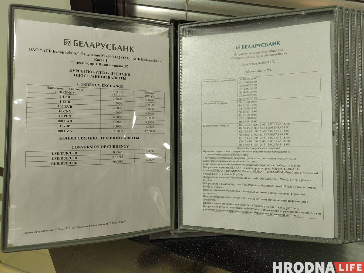 Яшчэ да пачатку таргоў курс долара ў абменніках Гродна дасягнуў 3,4 рубля, еўра – 3,8. Курс ужо быў вышэйшім, чым у першы дзень вайны. Таргі на Беларускай валютна-фондавай біржы 28 лютага вырашылі перанесці на гадзіну пазней, чым звычайна – на 11.00. У гэты ж час перастаў адкрывацца адзін з асноўных фінансавых парталаў Беларусі – Myfin.by.