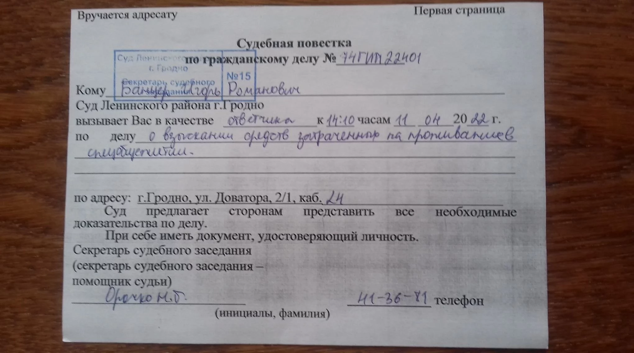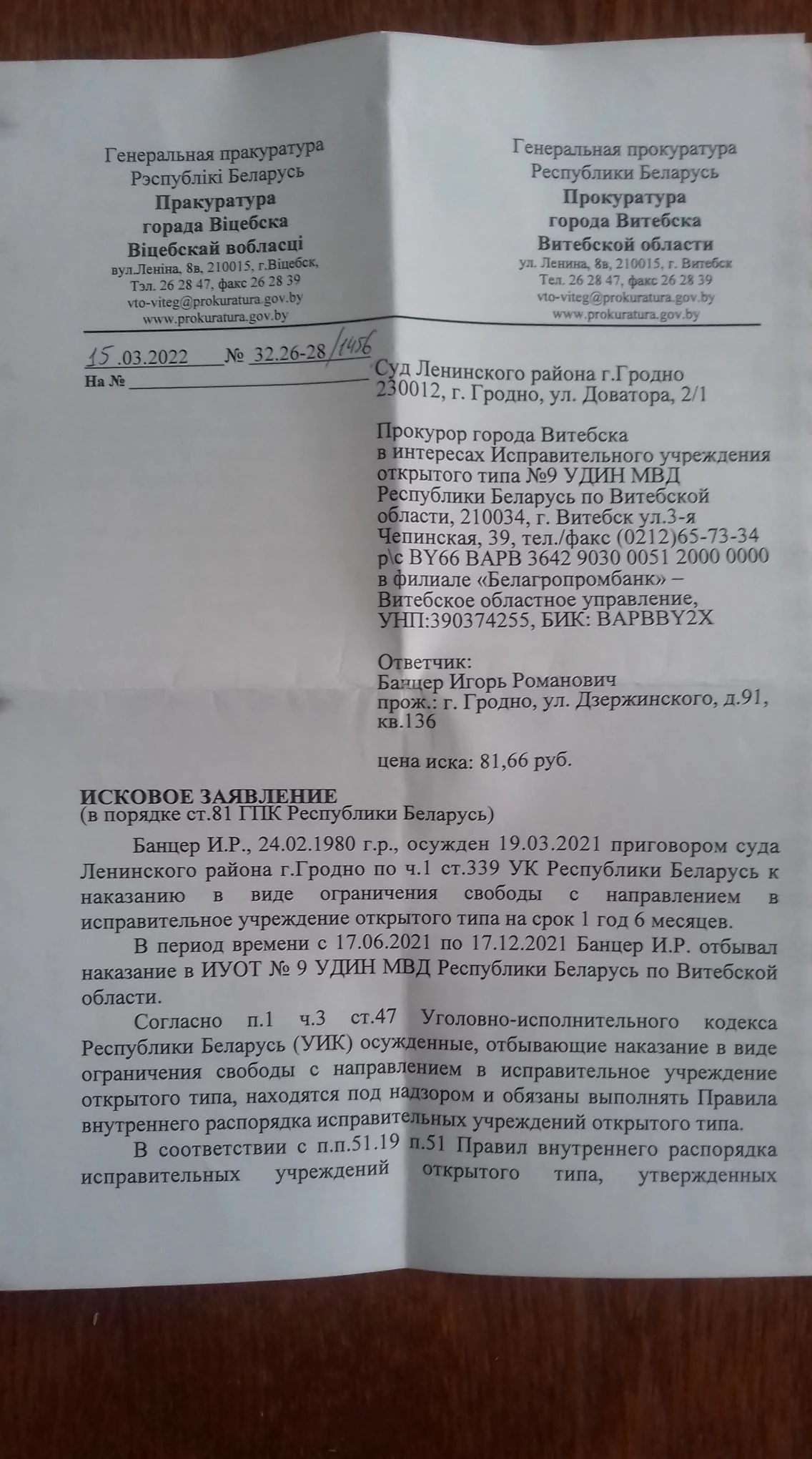 Суд па іску папраўчай установы адкрытага тыпу №9 у Віцебску да Ігара Банцэра пройдзе 11 красавіка ў 14.10 у судзе Ленінскага раёна Гродна. Фота позвы былы палітвязень выклаў у сябе ў Facebook.