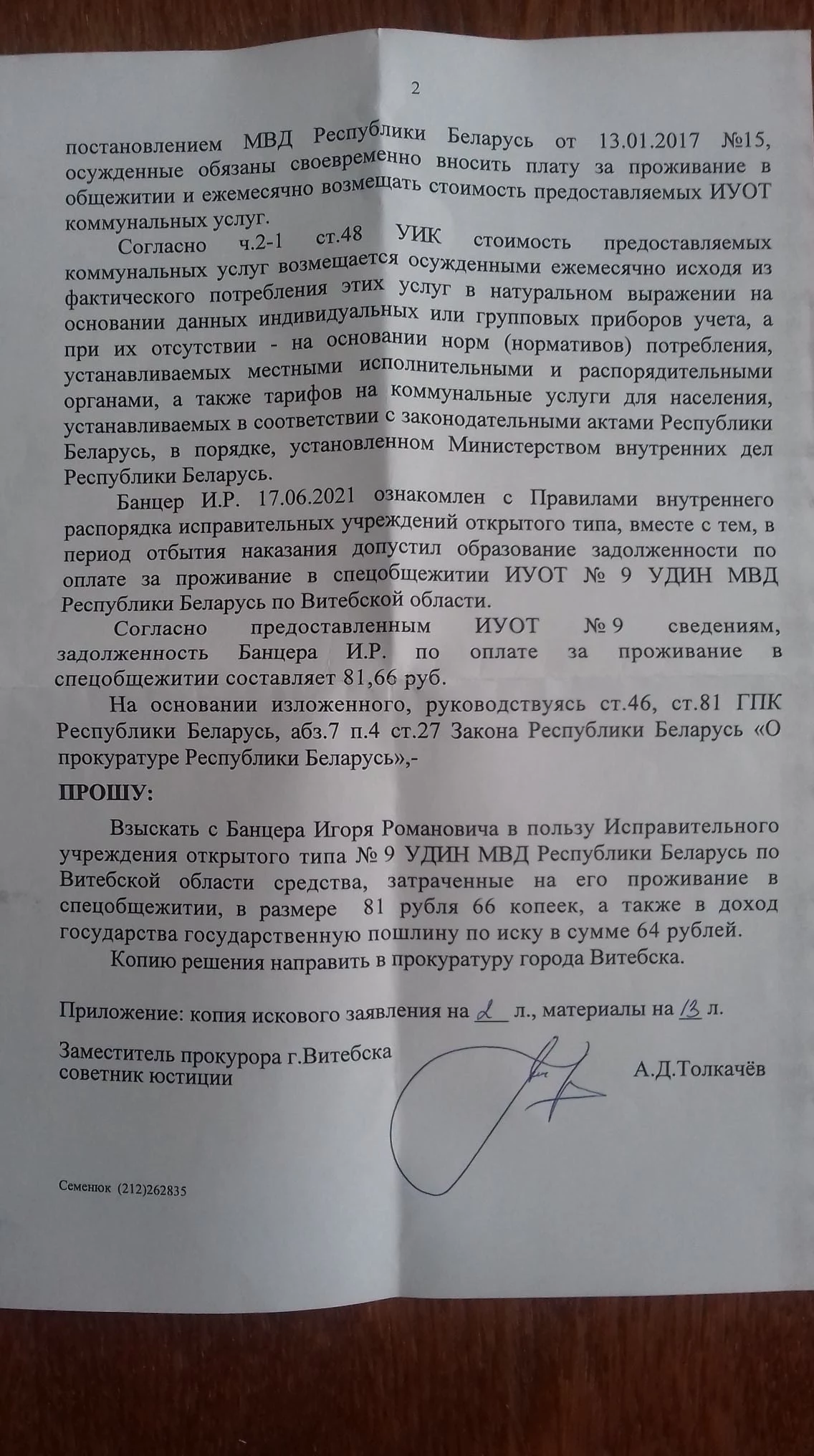 Цяпер – за камунальныя паслугі, якія ён павінен быў заплаціць, калі знаходзіўся на “хіміі”, піша Б**сат. Запазычанасць склала 81,66 рублі плюс пошліна 64 рублі. Банцэр плаціць не хоча, бо са 130 дзён ён правёў 82 дні ў штрафным ізалятары.