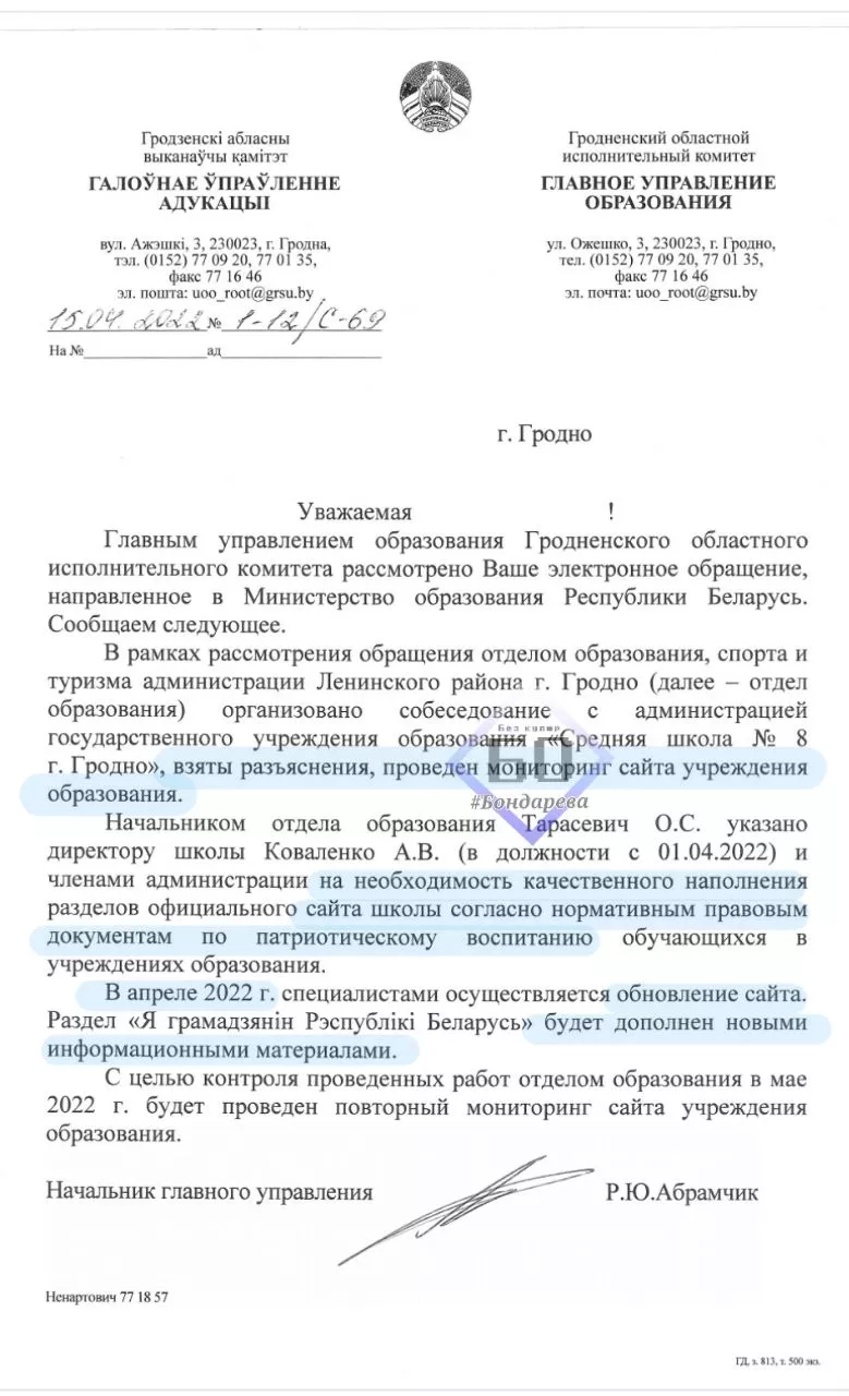 Пазней гродзенцы звярнуліся ў Міністэрства адукацыі. Зварот перанакіравалі ў Галоўнае ўпраўленне адукацыі Гродзенскага аблвыканкама. Адказ на яго за подпісам начальніка ўпраўлення Руслана Абрамчыка 15 красавіка размясціла ў Telegram-канале Вольга Бондарава.