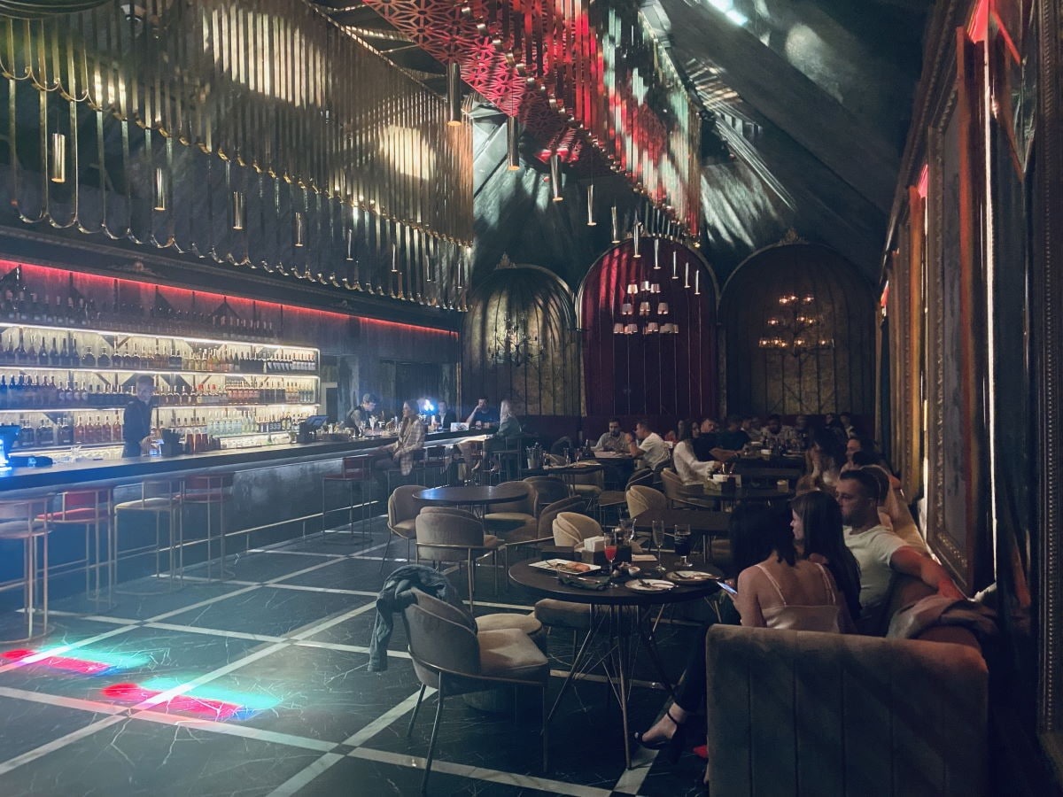 Первый зал интерьером напоминает кабаре и бурлеск-шоу Америки 1920-30-х. Он оформлен в красном и черном цветах, металлические элементы покрашены под золото. Среди декора – подвесные люстры и отдельно стоящие женские ноги. За широкой барной стойкой можно заказать напиток и посмотреть выступления танцоров в клетках либо на сцене.