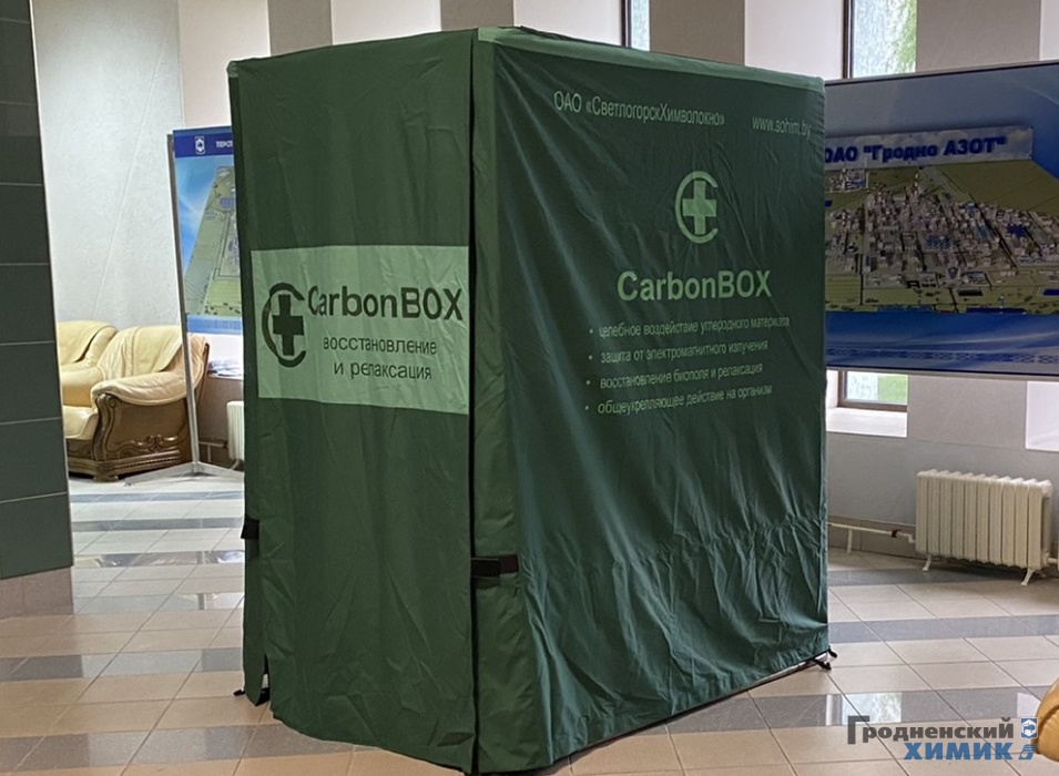 У будынку заводакіраўніцтва “Гродна Азот” уладкавалі рэлакс-зону. У фае ўсталявалі палатку з вугляроднай тканіны – CarbonBOX . Яна павінна ізаляваць чалавека ўнутры ад электрамагнітнага выпраменьвання і такім чынам аказваць лячэбны эфект, піша “Гродзенскі хімік”.