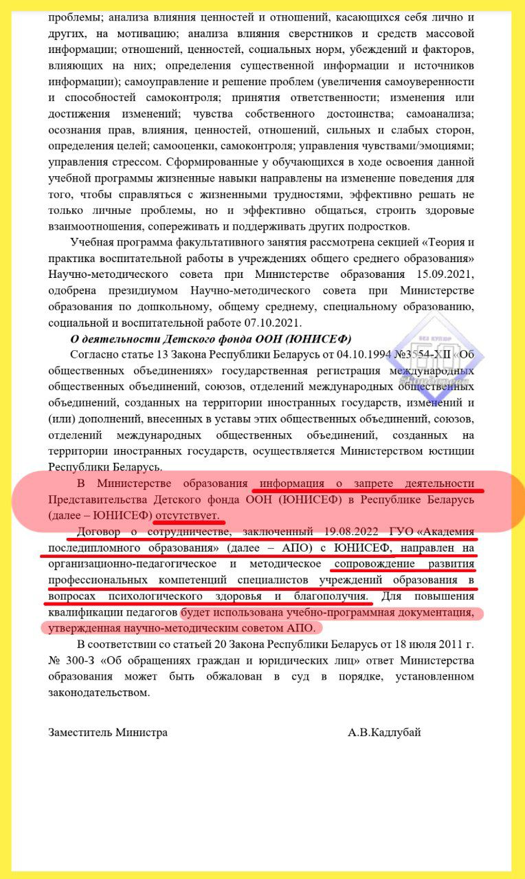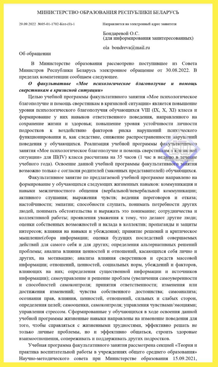 Гродзенская актывістка Вольга Бондарава паскардзілася ў Міністэрства адукацыі на праграму школьнага факультатыва, які стварылі разам ў ЮНІСЕФ “Мой псіхалагічны дабрабыт і дапамога равеснікам у крызіснай сітуацыі” для 9-11 класаў. У міністэрстве з ёй не пагадзіліся.