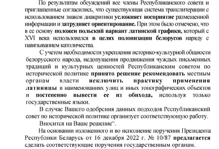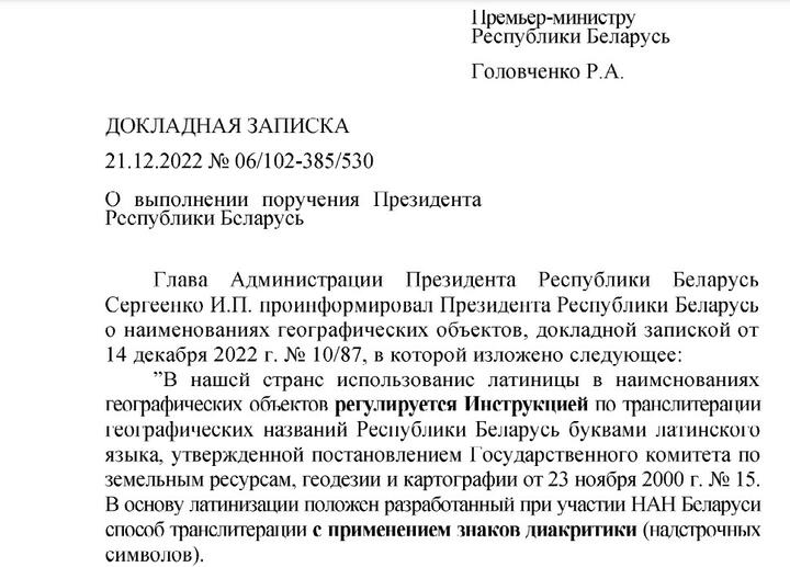 Апублікаваная дакладная запіска датаваная 14 снежня. Мяркуючы па дакуменце, пасля яе атрымання, 16 снежня, Аляксандр Лукашэнка падпісаў даручэнне № 10/87. Яно загадвае дзяржорганам выключыць выкарыстанне лацінкі.
