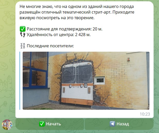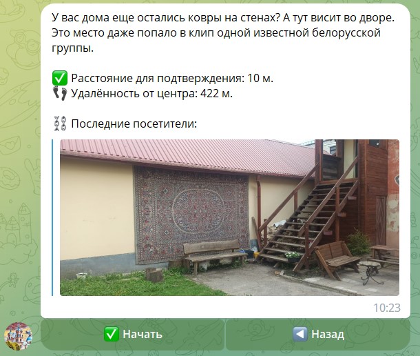 Атрымаўшы заданне, трэба націснуць “Пачаць” і выправіцца ў апісаную лакацыі. Пасля прыбыцця трэба ў плыні хвіліны націснуць на кнопку”Праверыць месца”. Калі месца адгадалі правільна, ваш нік у Telegram з’явіцца ў гэтым заданні ў графе”апошнія наведвальнікі”.