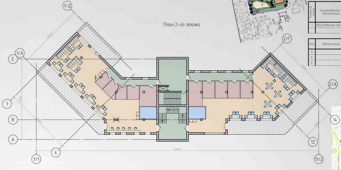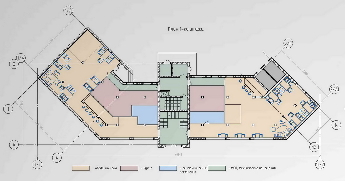 На першым паверсе будуць дзве абедзеныя залы, кухня, сантэхнічныя памяшканні, загрузная група, тэхнічныя памяшканні. На другім паверсе плануюць дзве абедзенныя залы з выхадам на летнія тэрасы (эксплуатаваны дах).