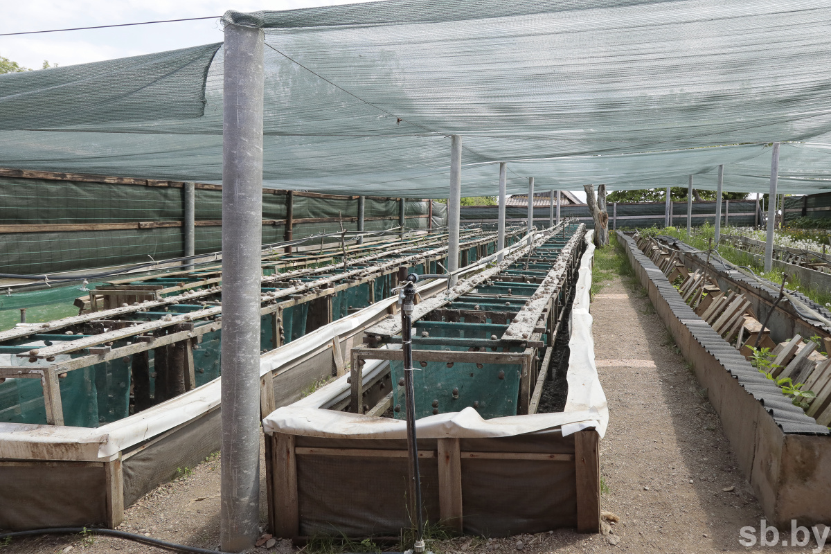 Слімакі жывуць у спецыяльных вальерах з бетону. Гэта даўгія бетонныя “загоны”, якія зараслі зелянінай. Над вальерамі нацягнута абарончая сетка, каб жывёлы не пераграваліся на сонцы. Таксама зверху ёсць сістэма паліву, бо слімакі любяць вільгаць.