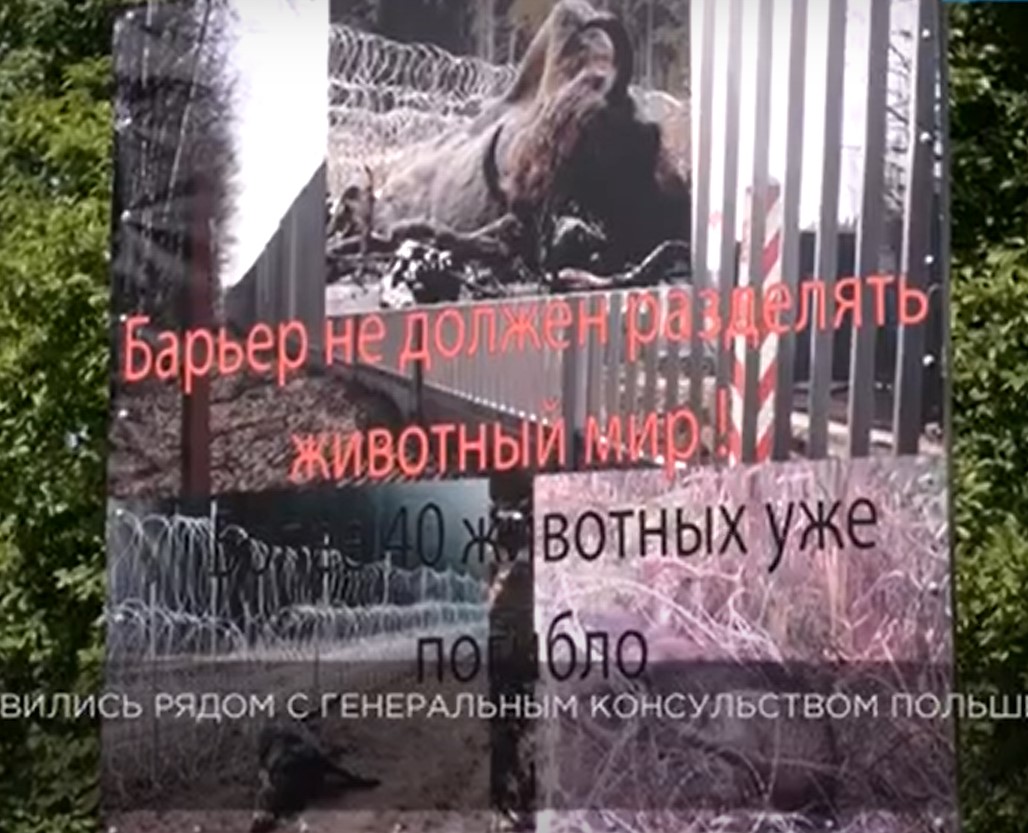 На трэцім плакаце фота мёртвых жывёл каля агароджы з калючага дроту і надпіс “Бар’ер не павінны падзяляць жывёльны свет! Больш за 40 жывёл ужо загінула”. Будаўніцтва пяціметровага плота на мяжы Польшчы і Беларусі польскі бок скончыў пяць дзён таму. Прычынай пабудовы стаў мігранцкі крызіс на межах Беларусі і Еўрасаюза, справакаваны беларускімі ўладамі.