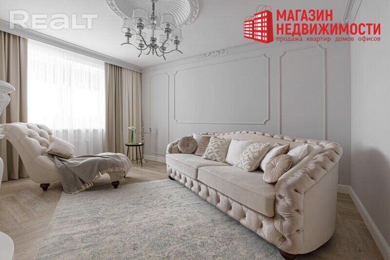 У кватэры ёсць мэбля. У адным з пакояў зроблена ніша з імітацыяй каміна. Над ёй – тэлевізар. У рамонце залы выкарыстоўвалі светлыя тоны. Дэталі – свечкі, карціны, вазы, статуэткі. На кухні – чорна-белая гама. Яшчэ адзін тэлевізар ёсць у спальні.