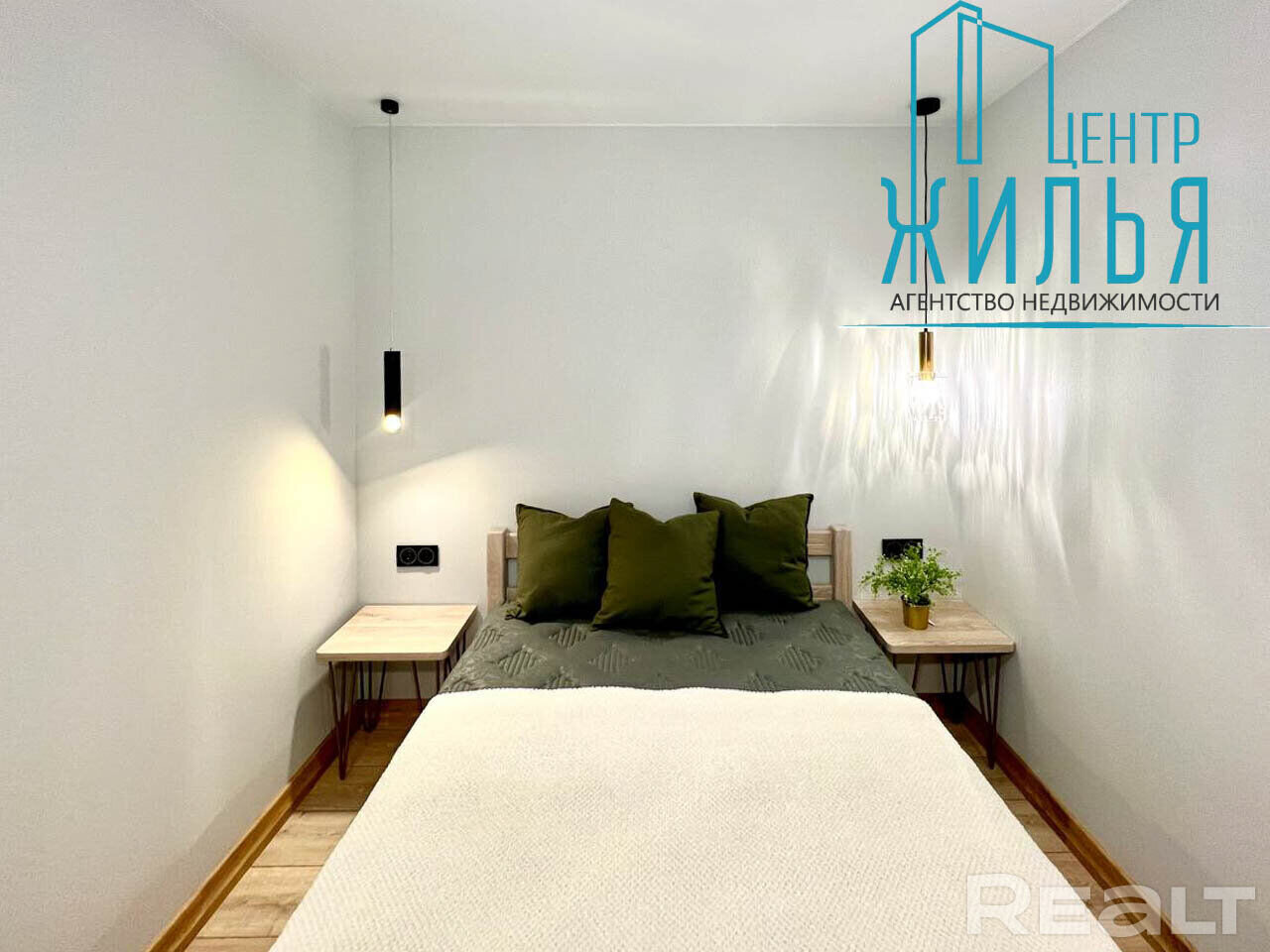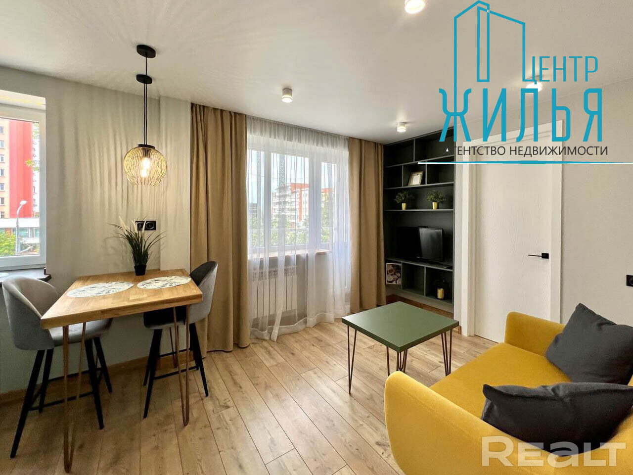 Кватэра кампактная – усяго 44 кв.м. Першапачаткова яна была трохпакаёвай, але ўладальнікі правялі ўзаконеную перапланіроўку. Цяпер у кватэры два пакоі, а кухня аб’яднана з гасцёўняй. Падчас рамонту залілі сцяжку, замянілі ўсю электрыку і сантэхніку, усталявалі новыя лічыльнікі і газавую калонку з сігналізатарам бяспекі.