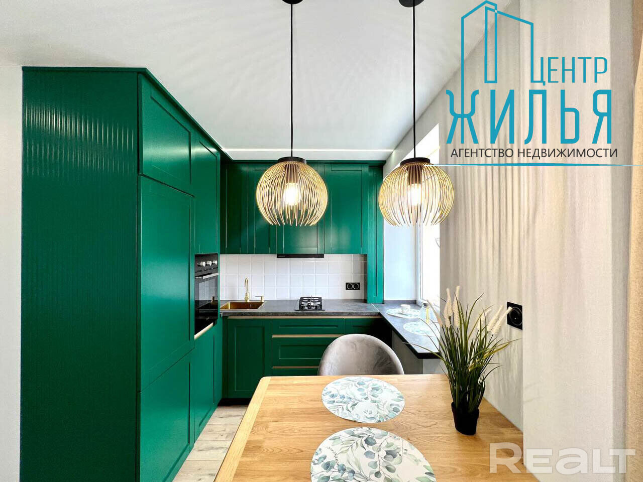 Перапланаваную савецкую кватэру з новым рамонтам у крокавай даступнасці да гістарычнага цэнтра прадаюць у Гродне. Яе фішка – утульны кухонны куток смарагдавага колеру.