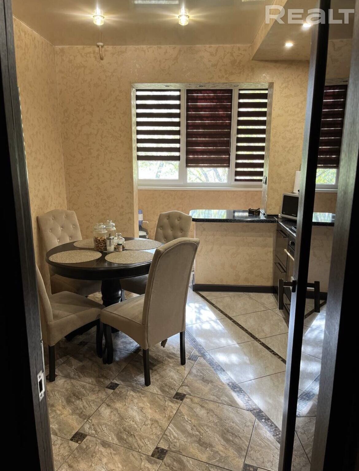 У кватэры частковы рамонт. На першым паверсе ў жылых пакоях на падлозе плітка, ламінат. Сцены выраўнаваны, абклееныя шпалерамі. Столі нацяжныя. На другім паверсе просты рамонт. У інтэр’еры пераважна выкарыстоўвалі чорныя, шэрыя і жоўтыя колеры. У гасціную з тэлевізарам вядзе арка.