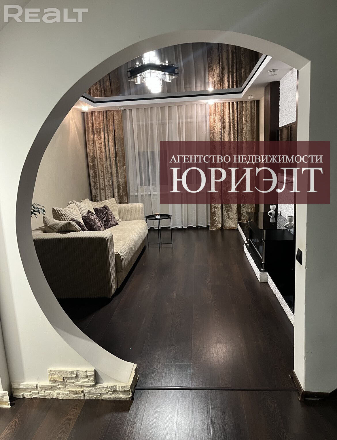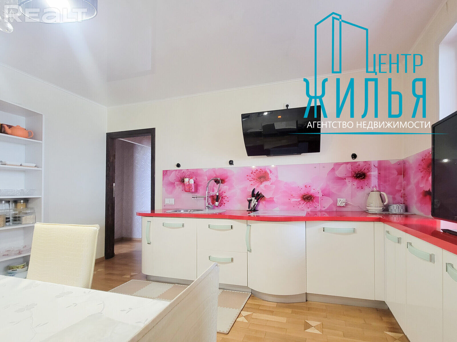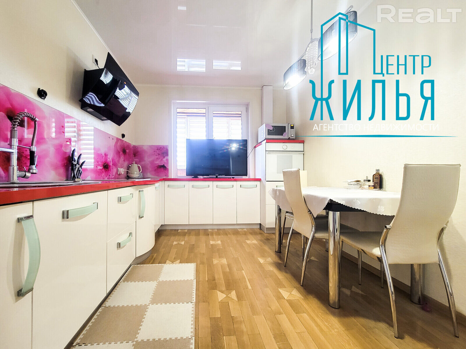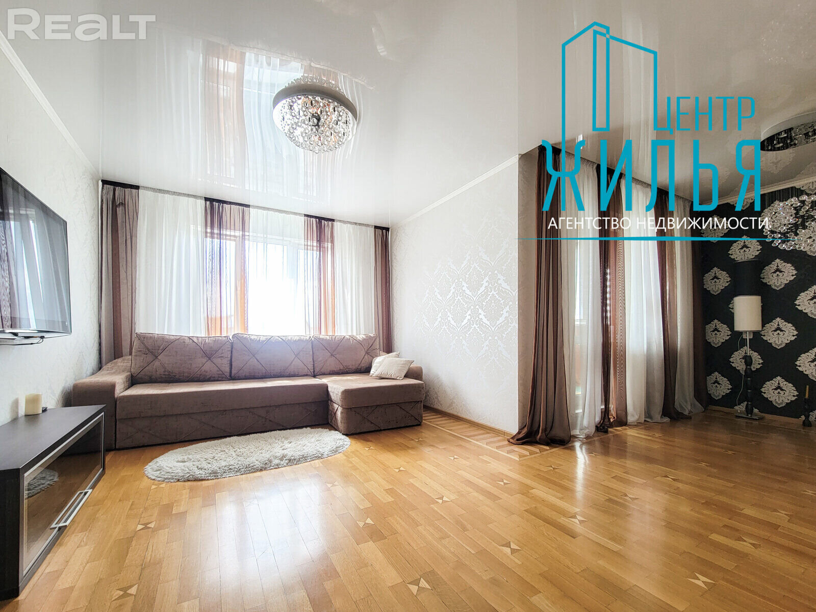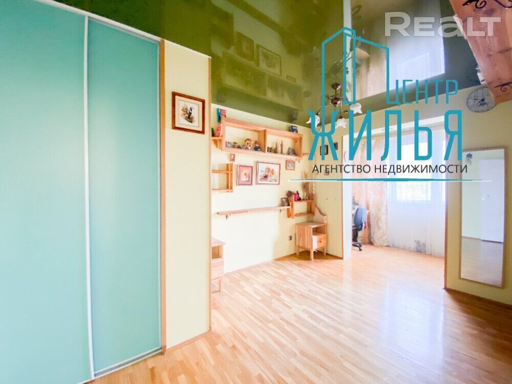На падлозе – паркет. Усе падлогі выведзеныя на адзін узровень. Кухня абсталявана ўбудаванай мэбляй і тэхнікай: індукцыйная варачная панэль, электрычная духавая шафа, выцяжка. У кватэры – дзве лоджыі. У гасцінай, кухні і адным з пакояў ёсць тэлевізары.