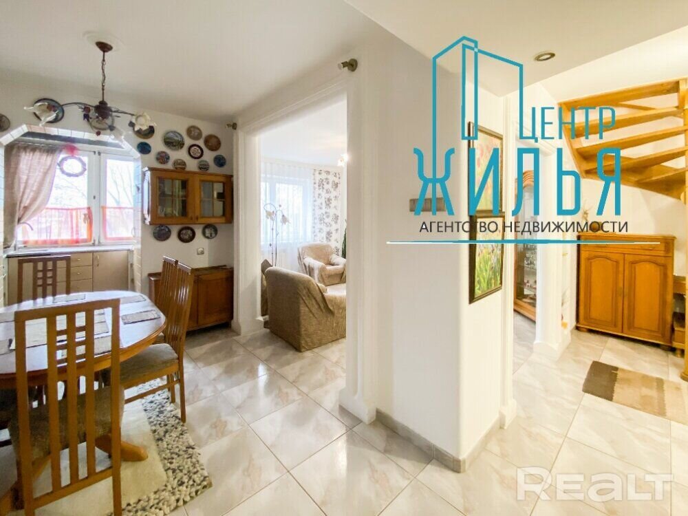 На першым узроўні ёсць гасцёўня, кухня і жылы пакой. На другім – тры спальні. У кватэры два санвузлы з вялікай кутняй ваннай і душавой кабінай.