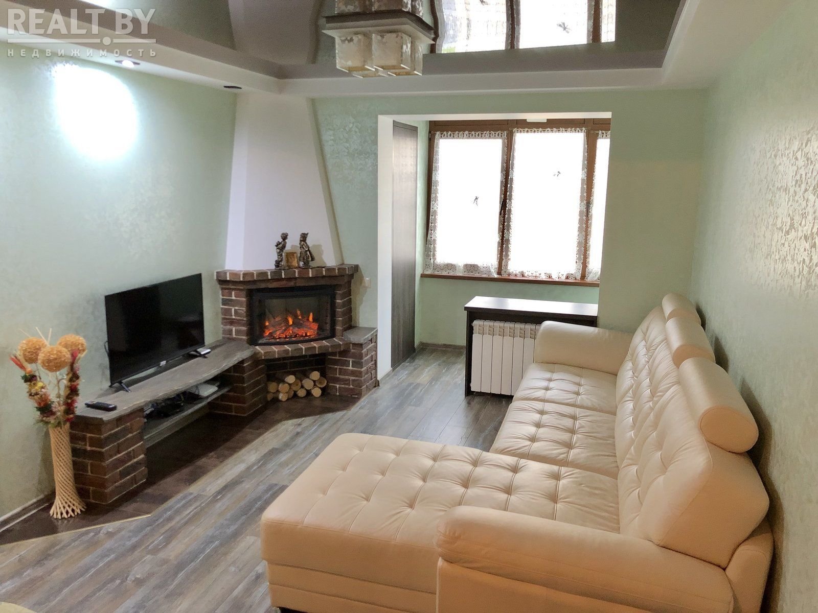 Аднапакаёвая кватэра з занаваннем і электракамінам прадаецца ў Гродне. Томіна, 14 / а. Кватэра прадаецца разам з мэбляй. Адзін пакой тут выконвае функцыі спальні і гасцінай — вось як гэта атрымалася.