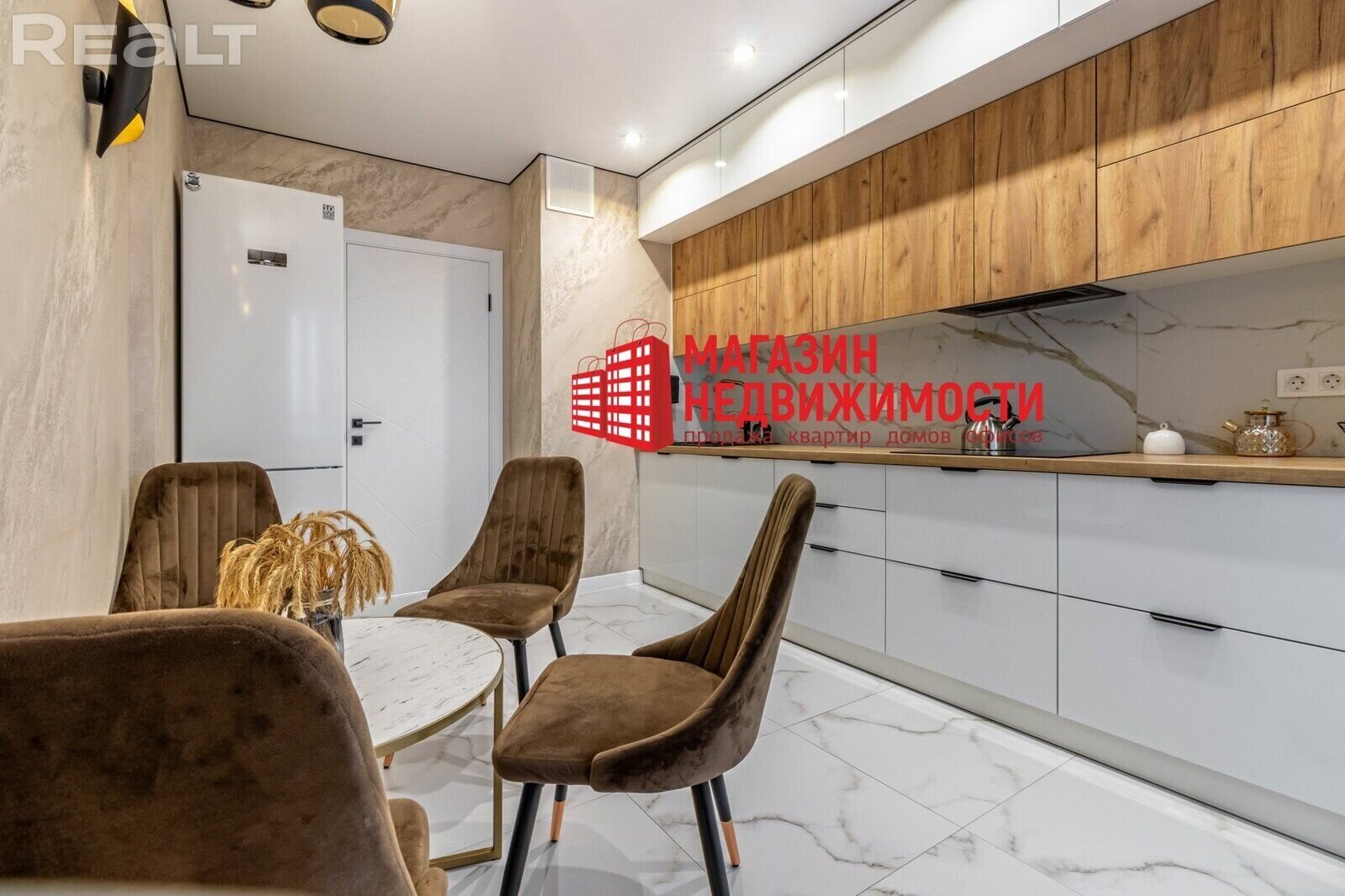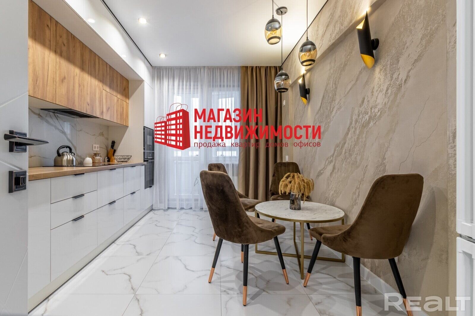 Па падлозе – керамаграніт і ламінат. У ваннай пакоі ўстаноўлена каменная стальніца з падвеснай тумбай, выкананыя на замову. Люстэрка – з падсветкай. Устаноўлена кухня: усе механізмы – з даводчыкамі BLUM, верхнія шафы — Aventos, бытавая тэхніка — Bosh і Elektrolux. Ёсць посудамыйная машына. Інтэр’ер на кухні таксама прадстаўлены карычневымі і бэжавымі тонамі. Ёсць маленькі столік, які, хутчэй, прыйдзецца замяніць — на фоне крэслаў ён выглядае нізкім.