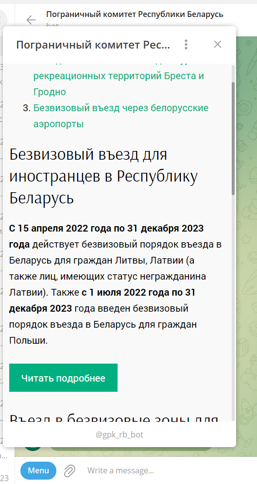 Беларускі дзяржаўны памежны камітэт распрацаваў Telegram-бот для падарожнікаў. У ім будуць трансляваць анлайн сітуацыю з чэргамі на мяжы. Бот даступны ў беларускай, англійскай і рускай версіях.