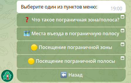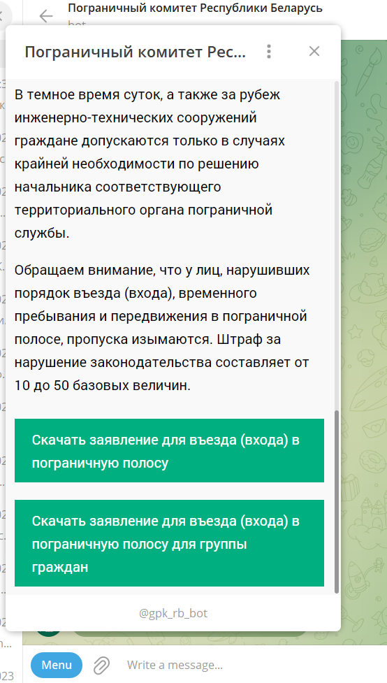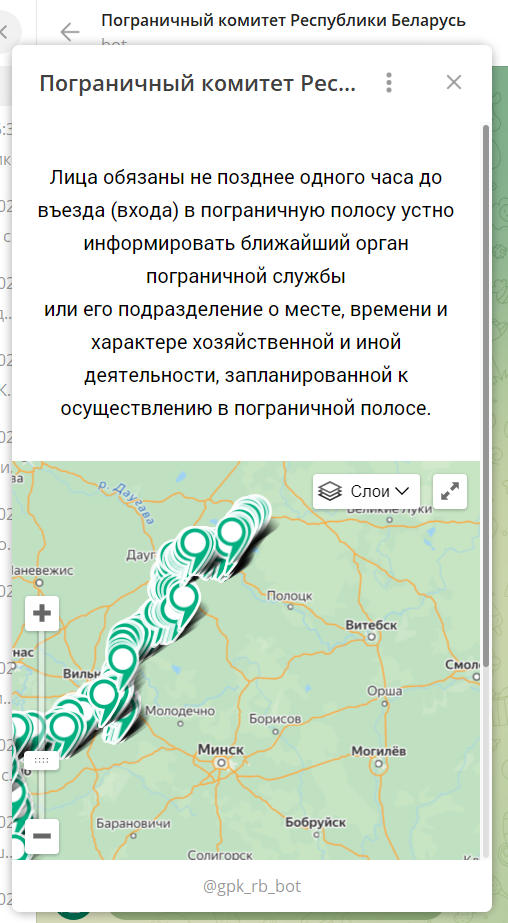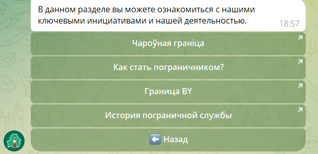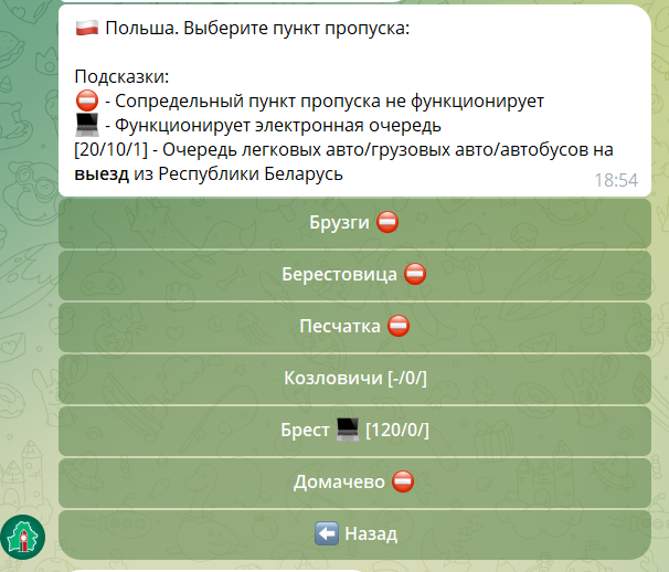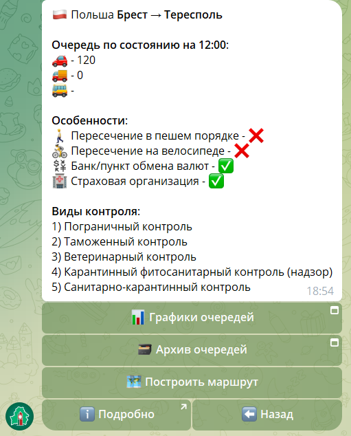Бот можа паказаць анлайн сітуацыю перад пунктамі пропуску і азнаёміцца з архівам чэргаў. Таксама з дапамогай робата прапануюць: