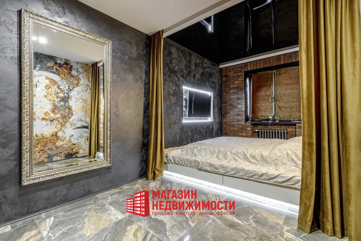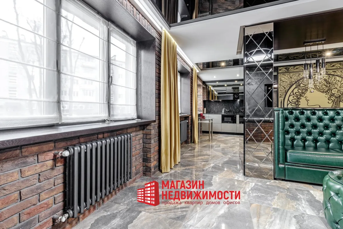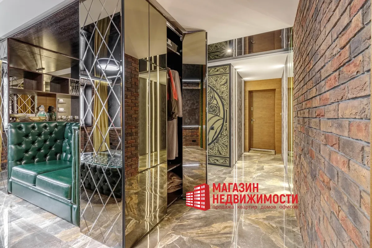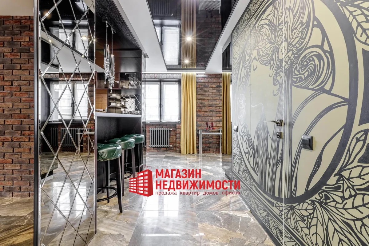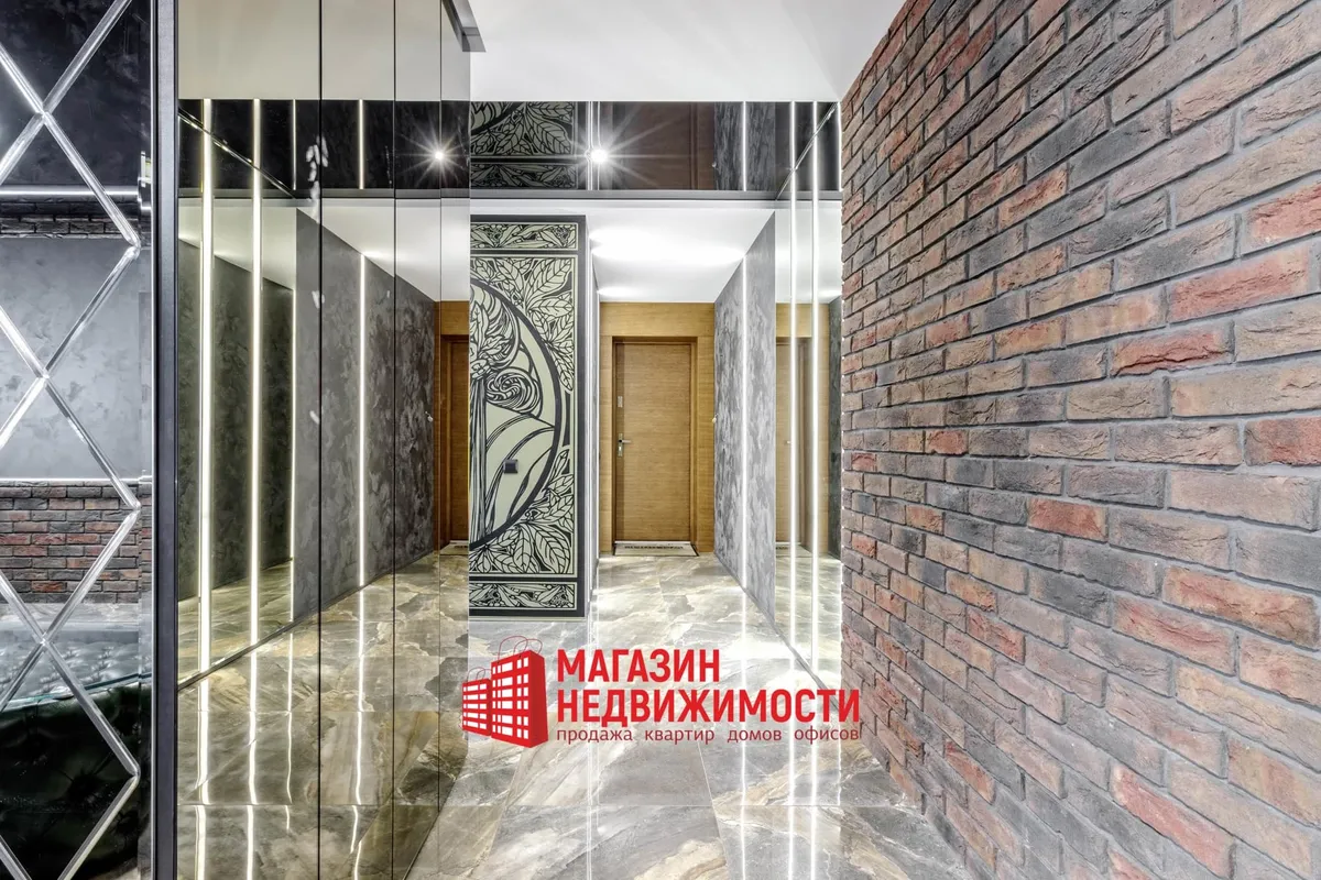 У кватэры выкладзеная стыльная італьянская плітка. Шафы схаваны ў прасторы люстэркамі. Кватэру распісаў мастак-дызайнер. Сцены абліцаваныя дэкаратыўнай цэглай. Радыятары ацяплення – таксама дызайнерскія.