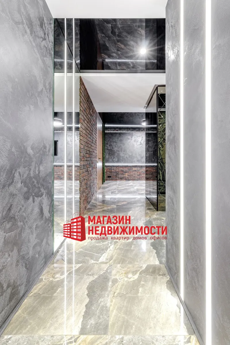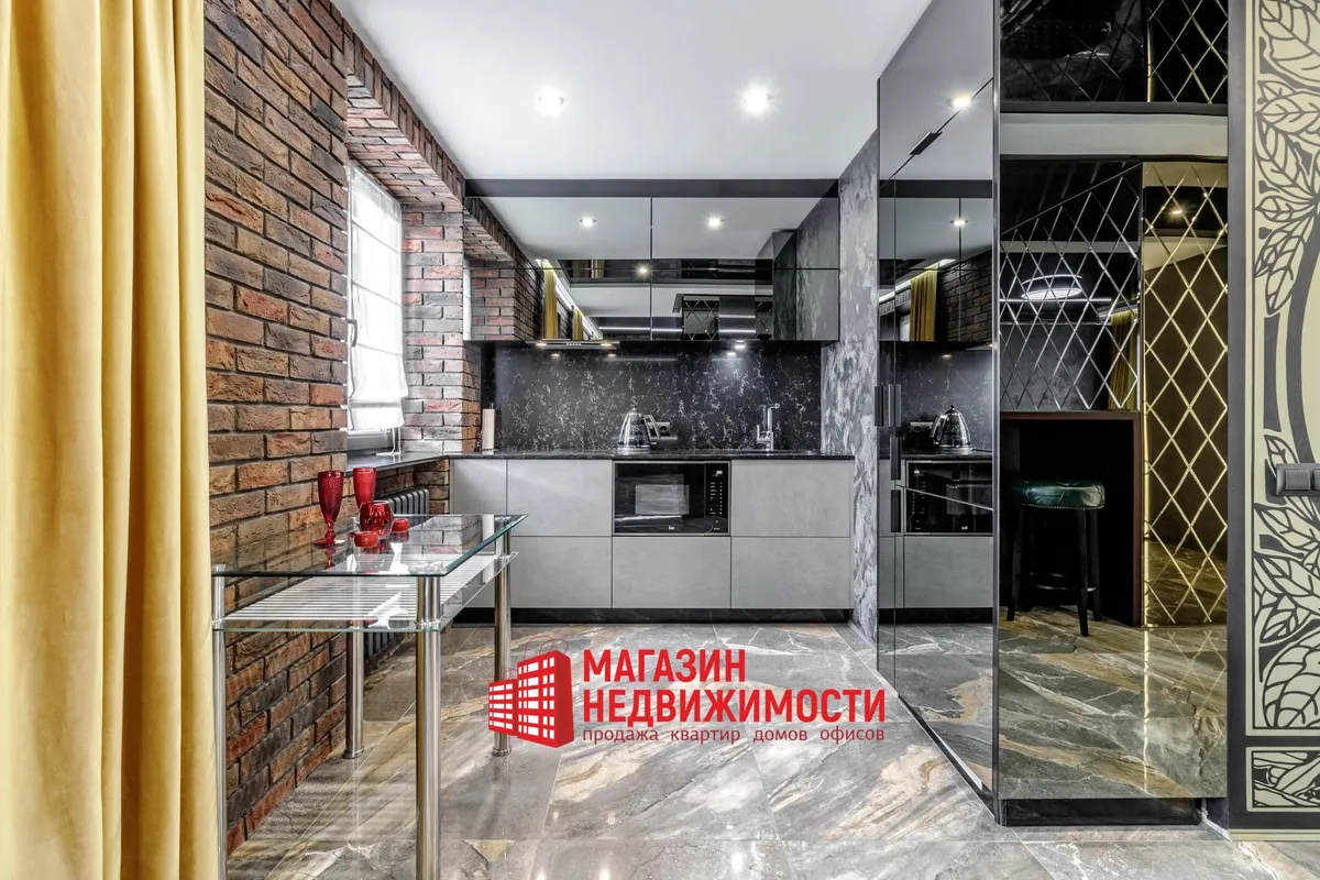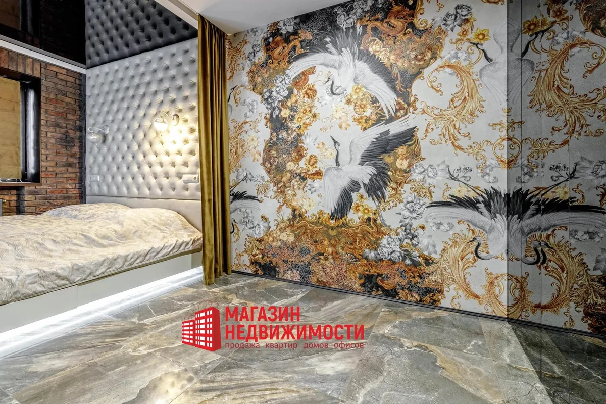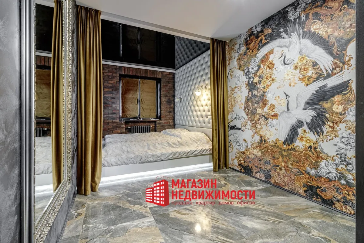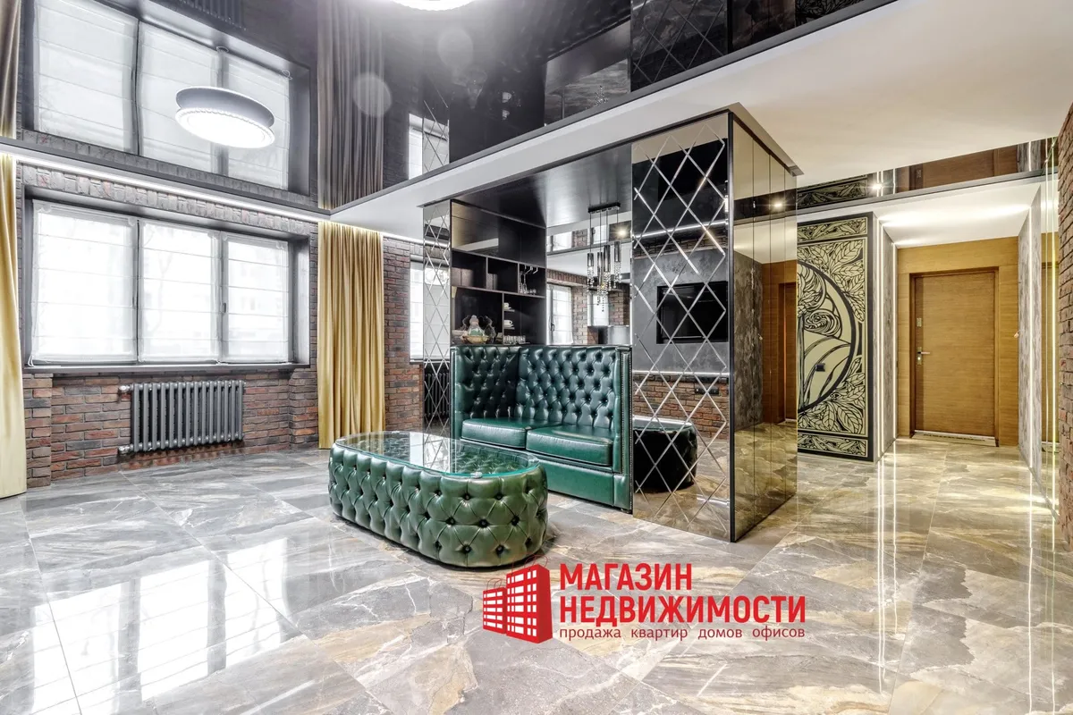 У кватэры выкладзеная стыльная італьянская плітка. Шафы схаваны ў прасторы люстэркамі. Кватэру распісаў мастак-дызайнер. Сцены абліцаваныя дэкаратыўнай цэглай. Радыятары ацяплення – таксама дызайнерскія.