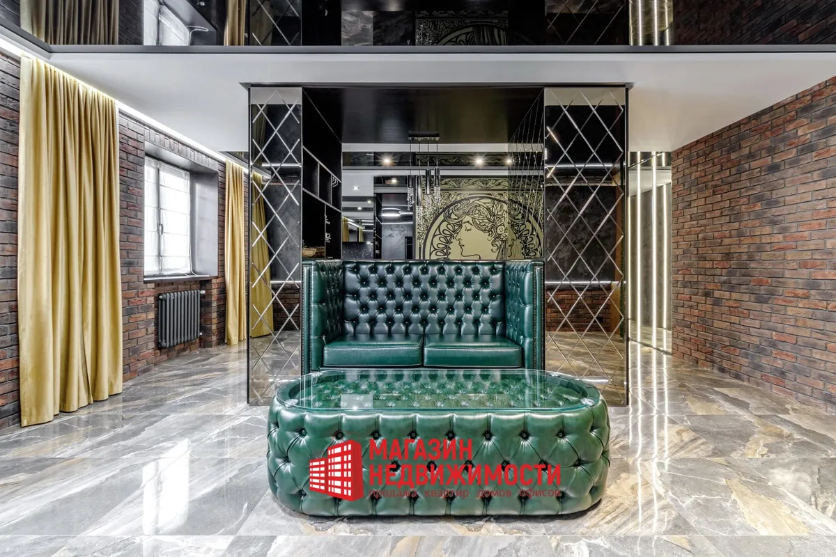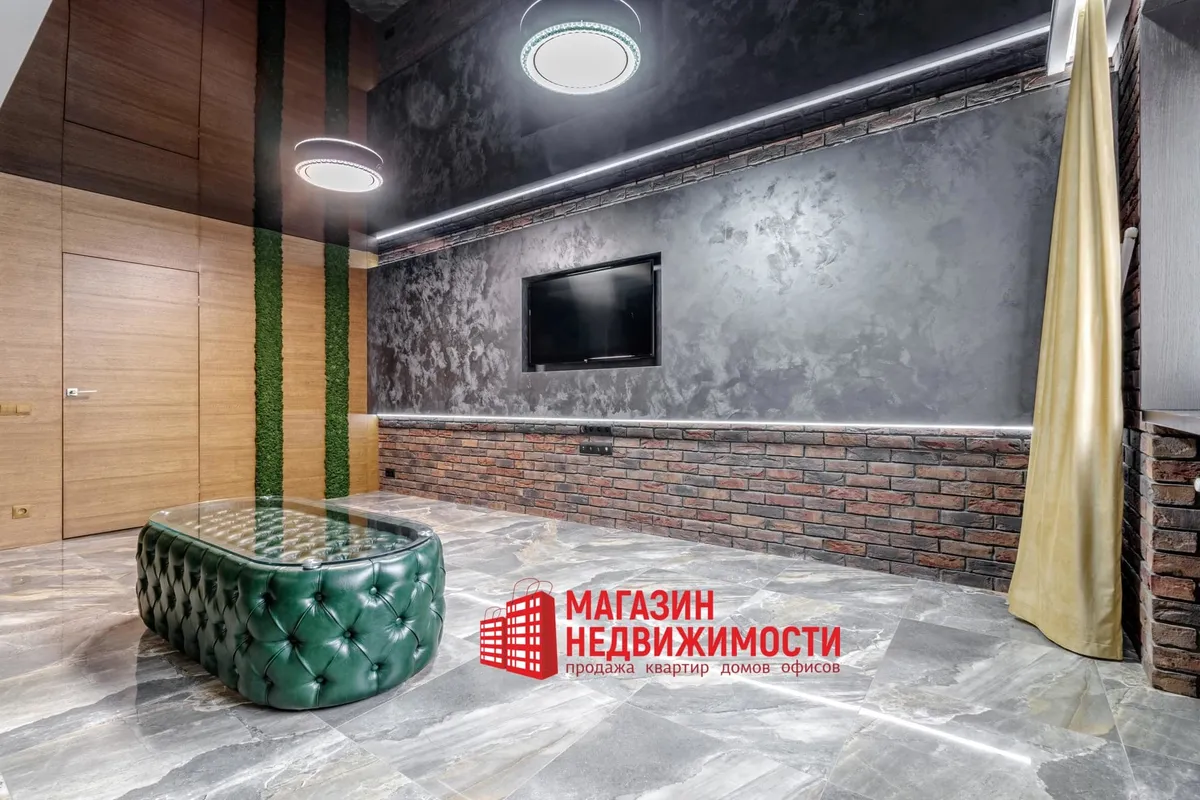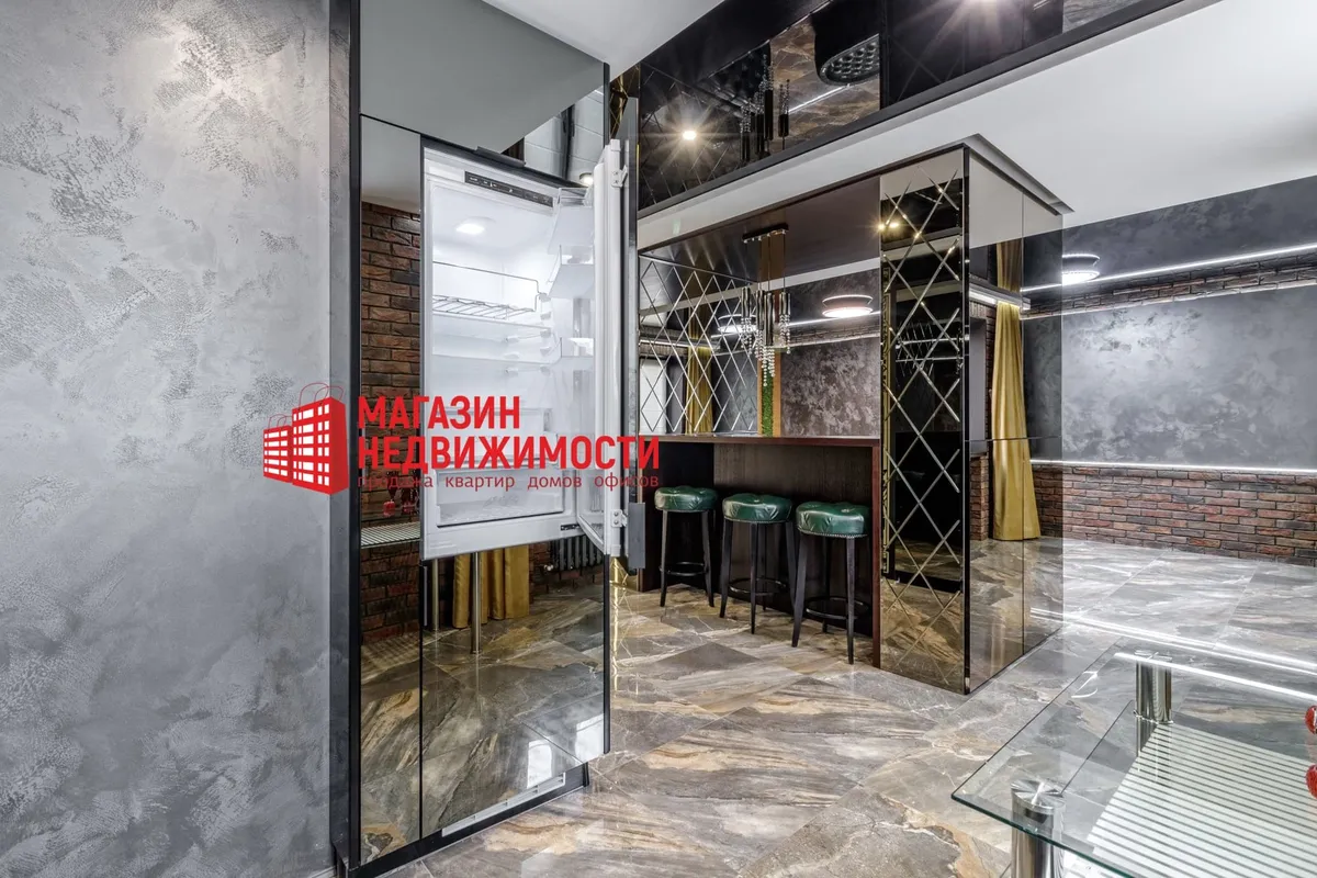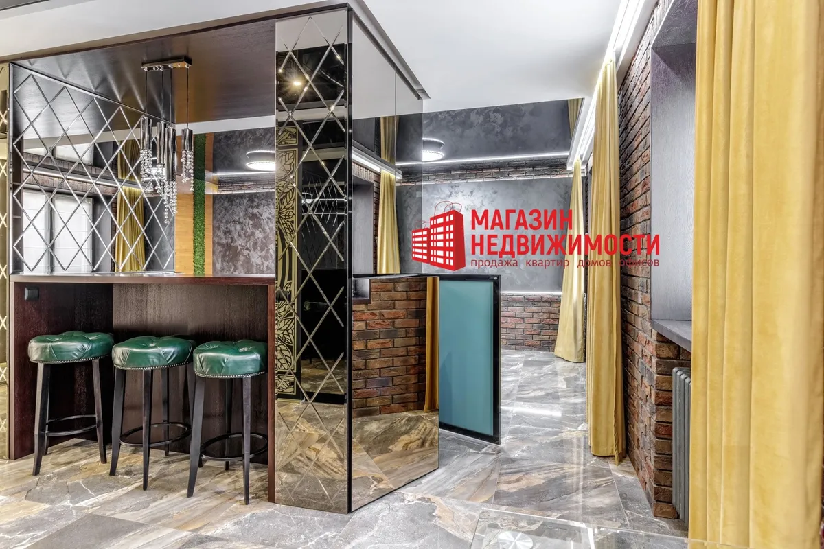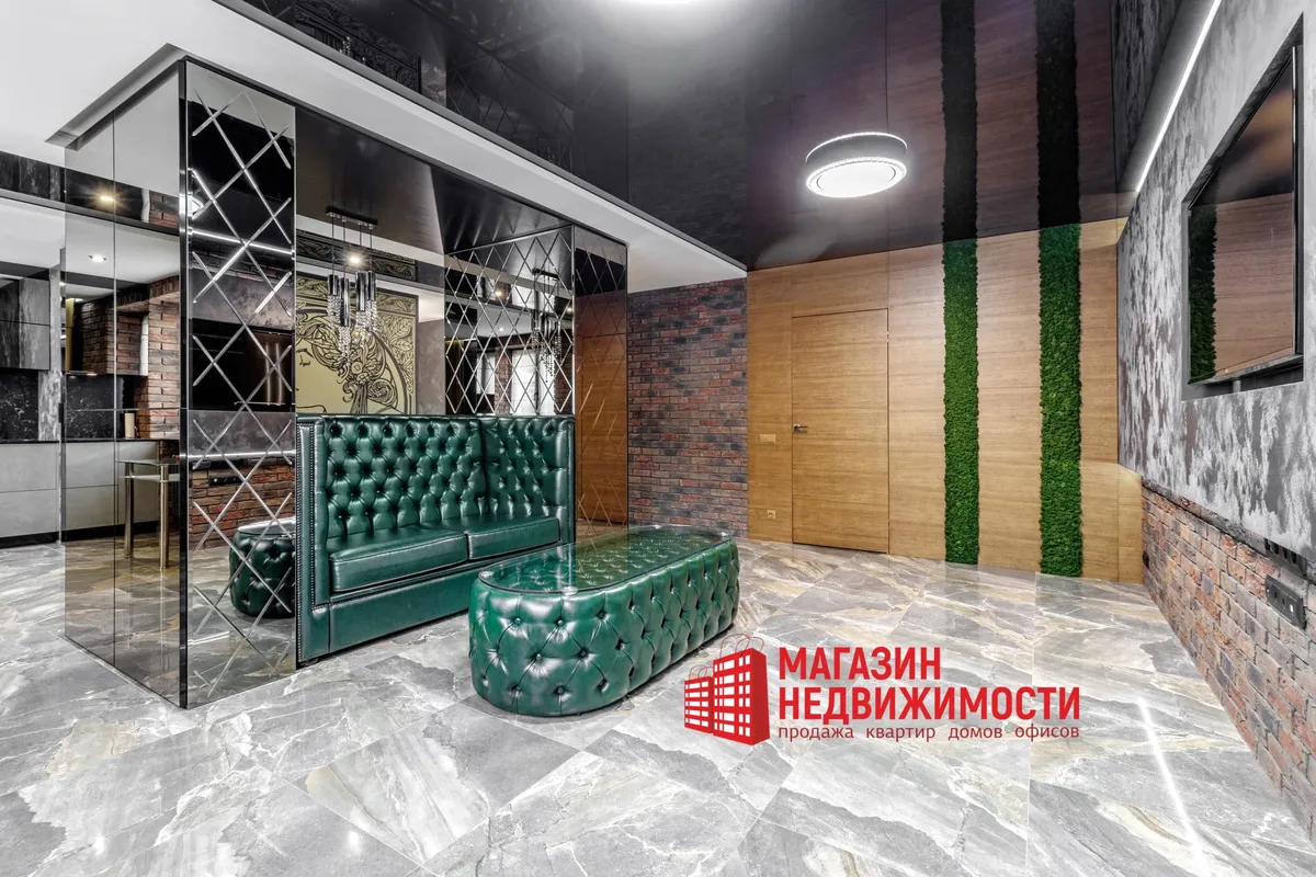 У кватэры выкладзеная стыльная італьянская плітка. Шафы схаваны ў прасторы люстэркамі. Кватэру распісаў мастак-дызайнер. Сцены абліцаваныя дэкаратыўнай цэглай. Радыятары ацяплення – таксама дызайнерскія.