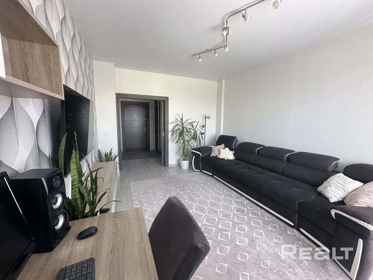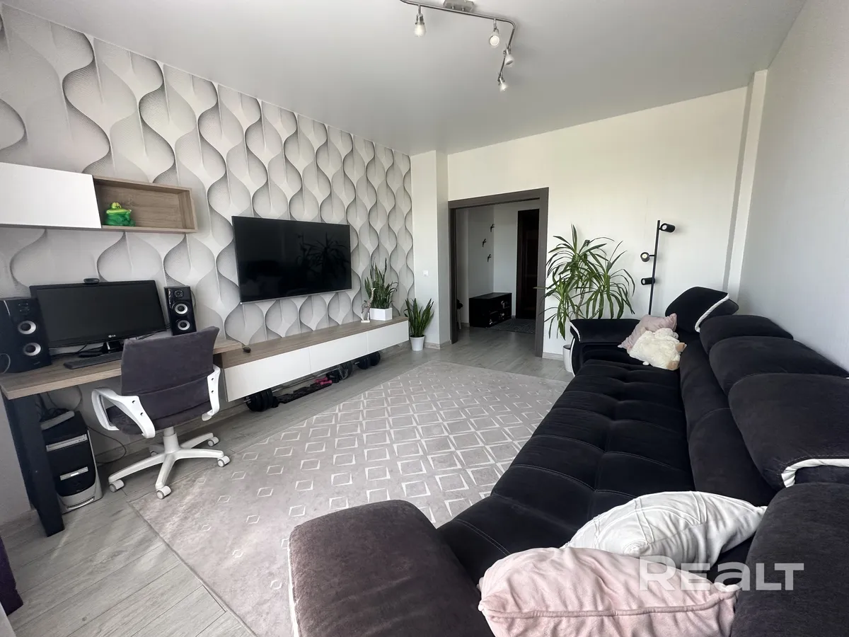 Зала ў белых колерах сумешчана з кабінетам — ёсць камп’ютарны стол. Месца для захоўвання ёсць у прыхожай. Таксама арганізавалі невялікую гардэробную.