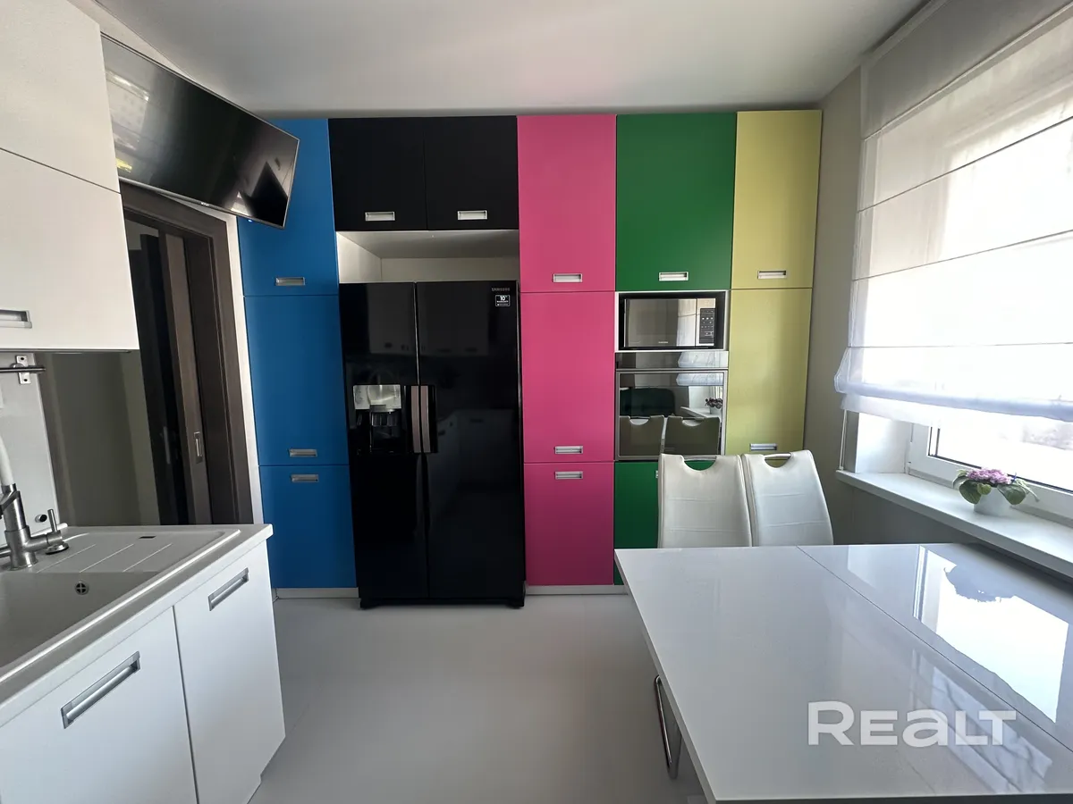 На кухні ёсць халадзільнік з генератарам лёду з аўта-падачай вады. Кухонныя шафкі ў столь – розных колераў. Ёсць закрытыя шафкі і адкрытыя паліцы. Кран і ракавіна — белага колеру, на такім не бачныя разводы.