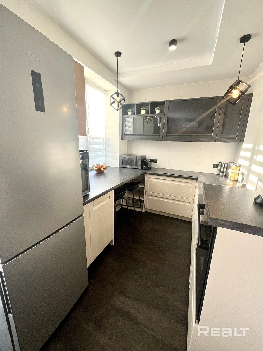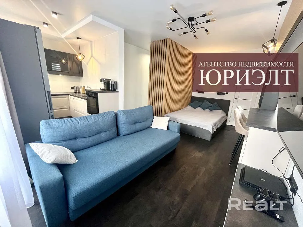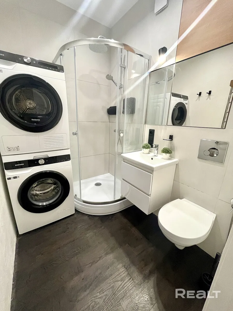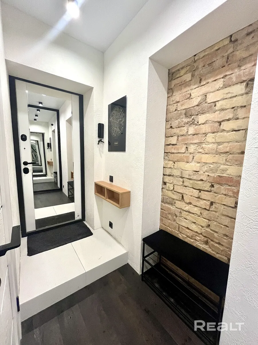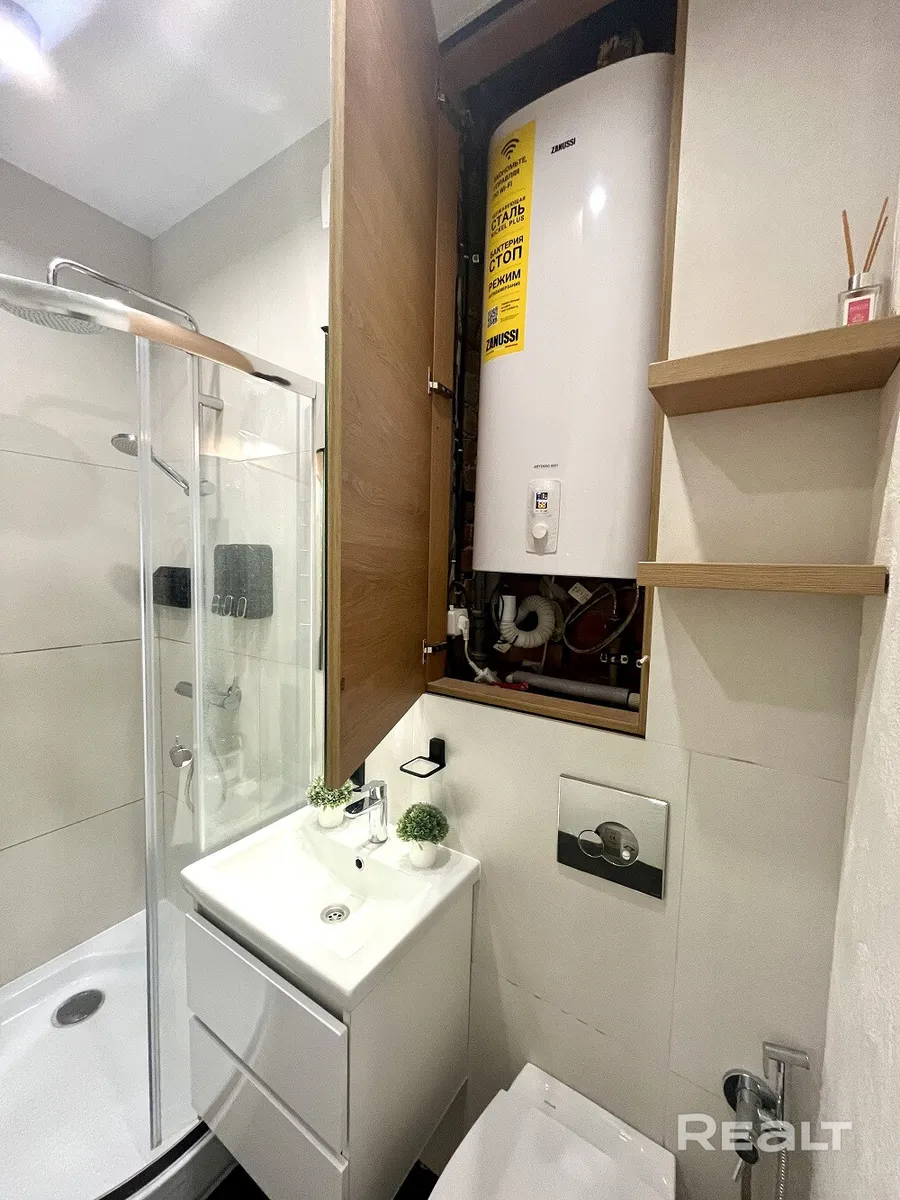 Кватэра размешчана на апошнім паверсе чатырохпавярховага дома. Агульная плошча – 33,2 м2. У ёй замянілі камунікацыі – электрыку, трубы. Зрабілі рамонт з дарагімі матэрыяламі, сцвярджаюць гаспадары. Усталявалі электрычны бойлер з аддаленым кіраваннем. Ёсць кандыцыянер. Санвузел – сумешчаны. Там ёсць душавая кабіна. З досыць рэдкага – сушыльная машына.