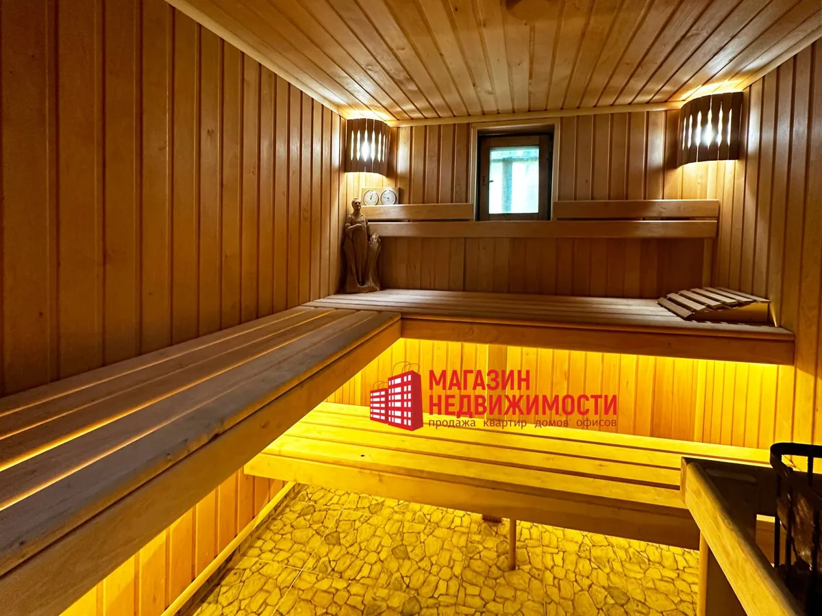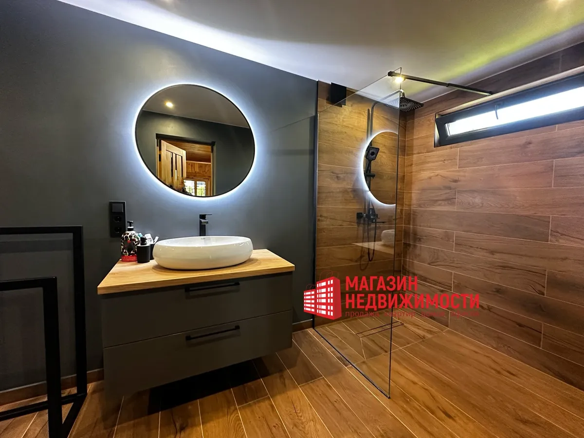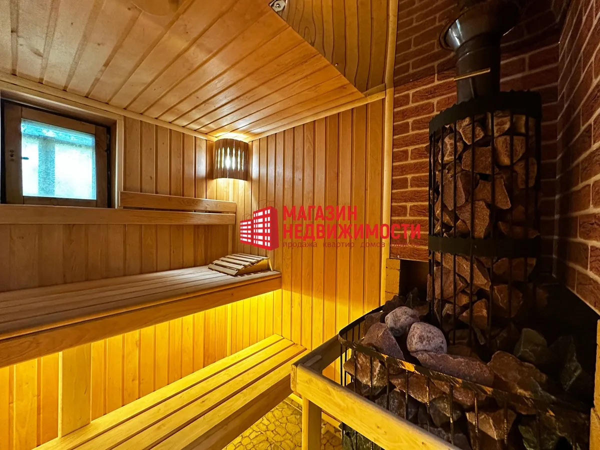 У лазні ўсталявалі бойлер для нагрэву вады на 80 л і кацёл, з дапамогай якога лазня распальваецца за 1,5 гадзіны. У апарні — лунаюць паліцы з ценявы падсветкай.