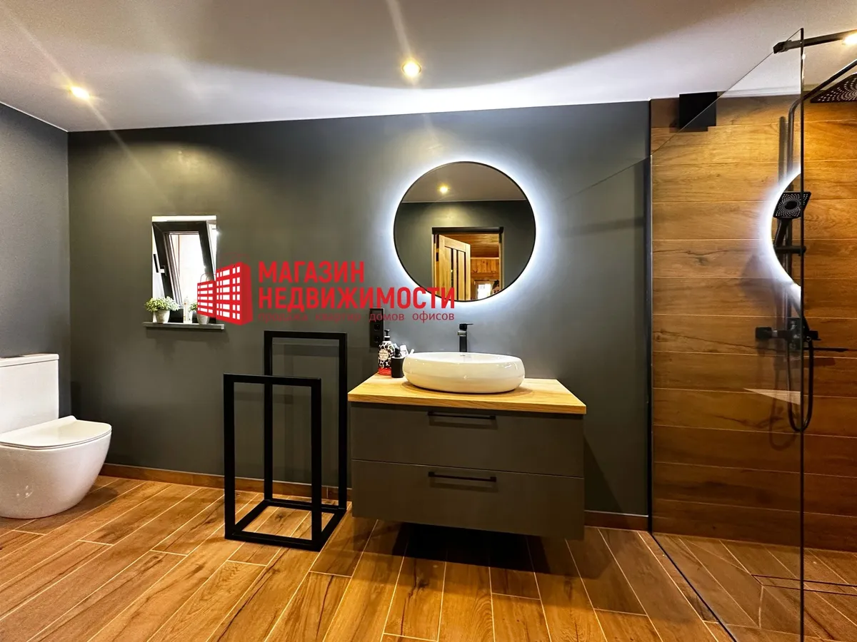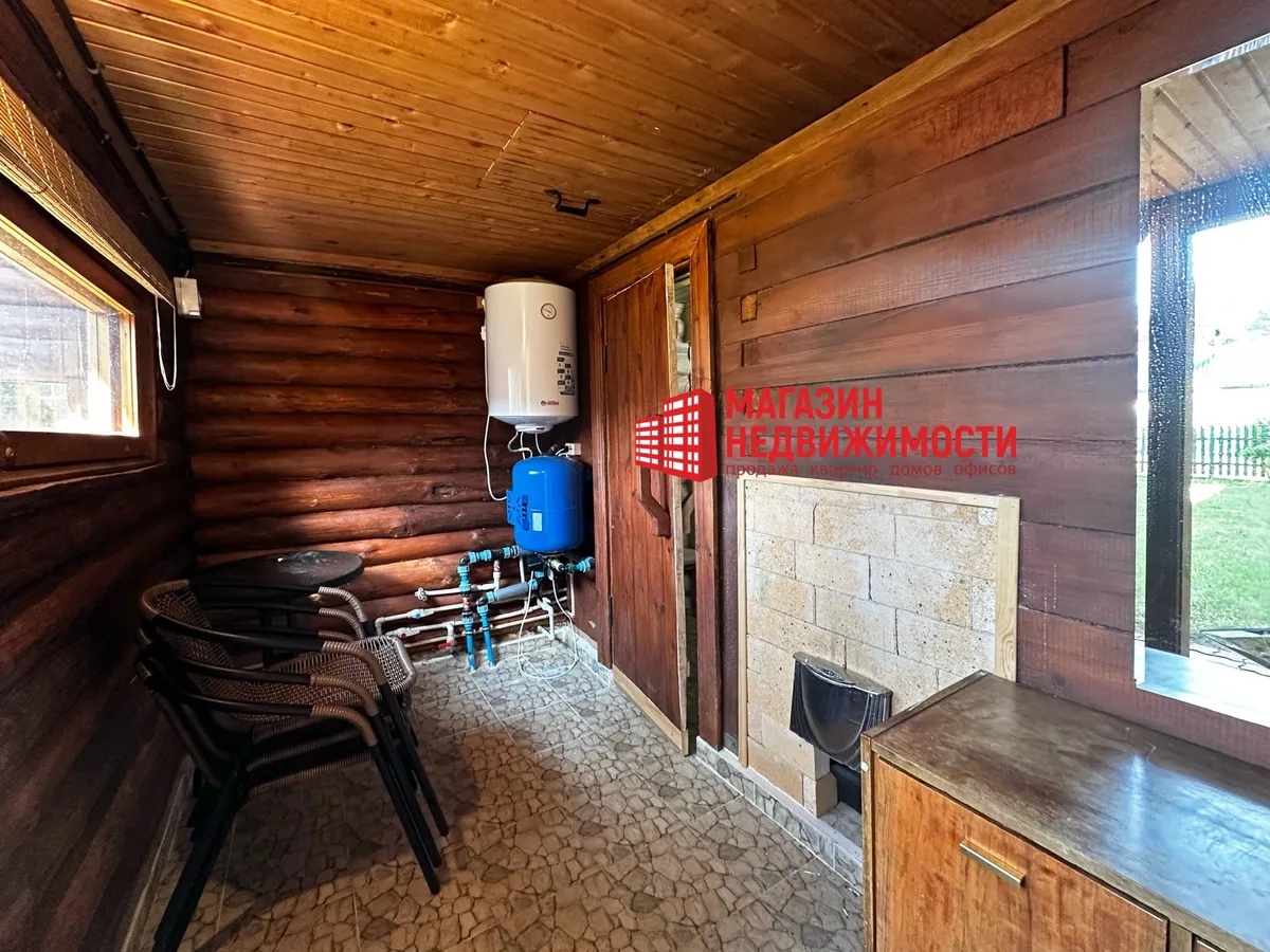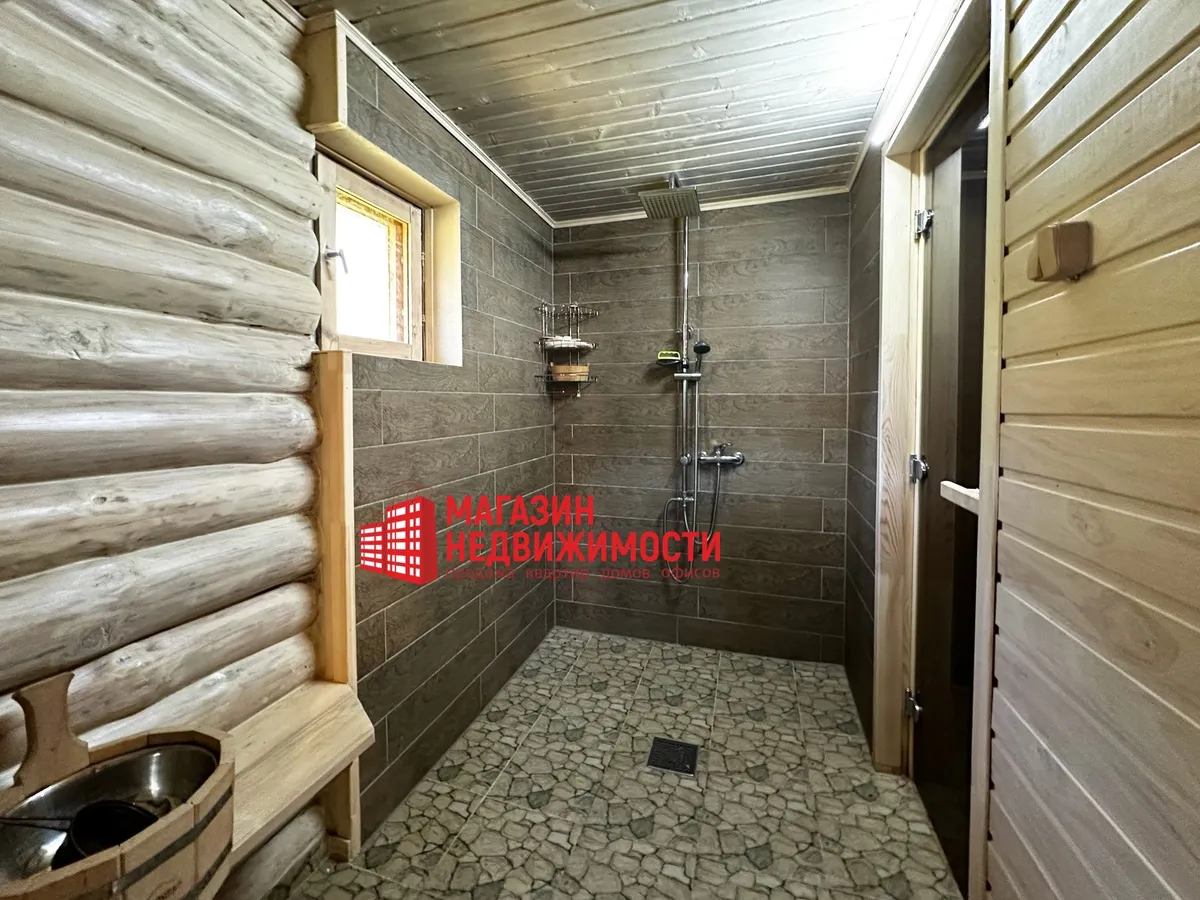 У лазні ўсталявалі бойлер для нагрэву вады на 80 л і кацёл, з дапамогай якога лазня распальваецца за 1,5 гадзіны. У апарні — лунаюць паліцы з ценявы падсветкай.