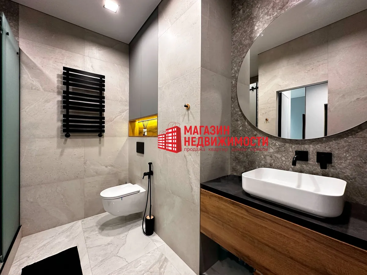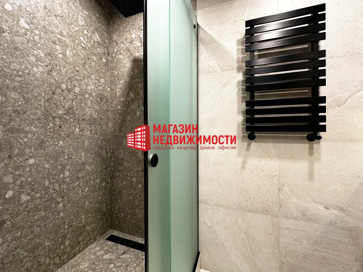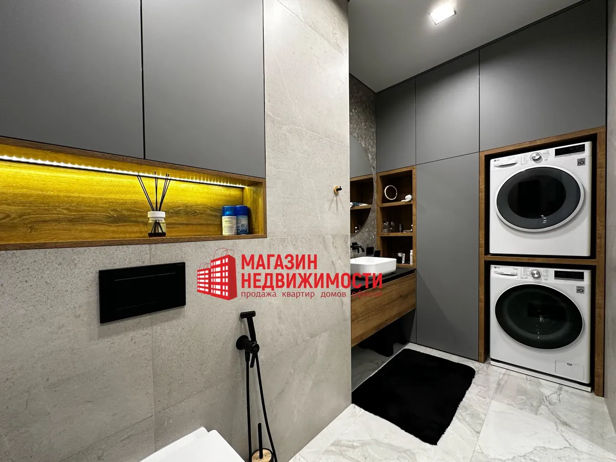У санвузле ёсць душ, падвесны ўнітаз з інсталяцыяй, пральная і сушыльная машыны, электрабойлер. Вокны ў кватэры выходзяць на два бакі, тры балконы, ёсць свая кладоўка ў падвале.