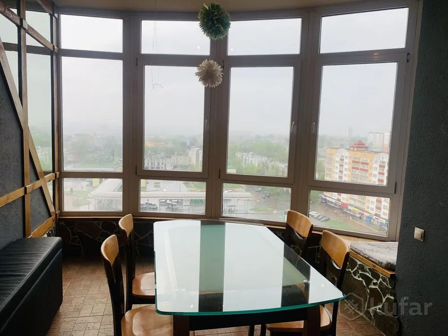 З кухні ёсць выхад на вялікую лоджыю з вокнамі практычна ў падлогу, адкуль адкрываецца від на горад. У кватэры – “паўтара” санвузла. Адзін – туалет, і другі — памяшканне з ваннай, унітазам і бідэ.