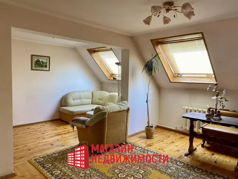 Па ўсёй кватэры (акрамя кухні) устаноўлены мансардныя вокны. Сама кухня даволі маленькая, усяго 4,3 кв.м, і падыдзе толькі для гатавання. З кухні ёсць выхад у вялікі пакой на першым паверсе. Прастора занаваная так, што частка яе – гэта сталовая, а частка – жылы пакой. Па фота відаць,