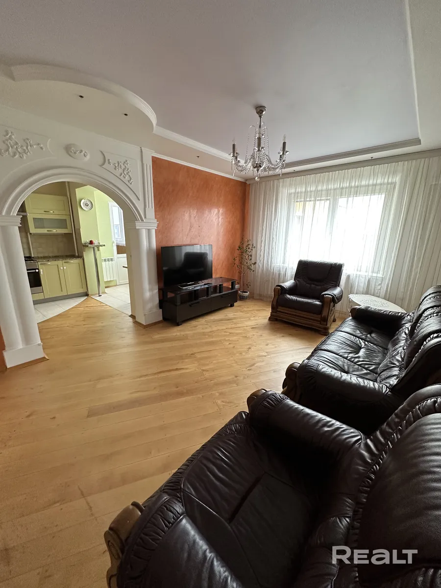 У гасцінай спалучаюцца брутальныя скураныя канапы, модныя ў 90-х, і рамантычная арка на месцы дзвярнога праходу. Арка ўпрыгожана ляпнінай і калонамі, яе верхняя частка пераходзіць у аб’ёмную столь, на якой размясціліся шкляныя люстры. З гасцінай можна патрапіць на пастэльна-зялёную кухню. На падлозе – дрэва пры ўваходзе і плітка, выкладзеная паўкругам, пад працоўнай часткай кухні. Абедзенная частка знаходзіцца ў паглыбленні каля акна. Сталовую паспрабавалі аддзяліць ад кухні вельмі маленькім столікам на высокай ножцы.