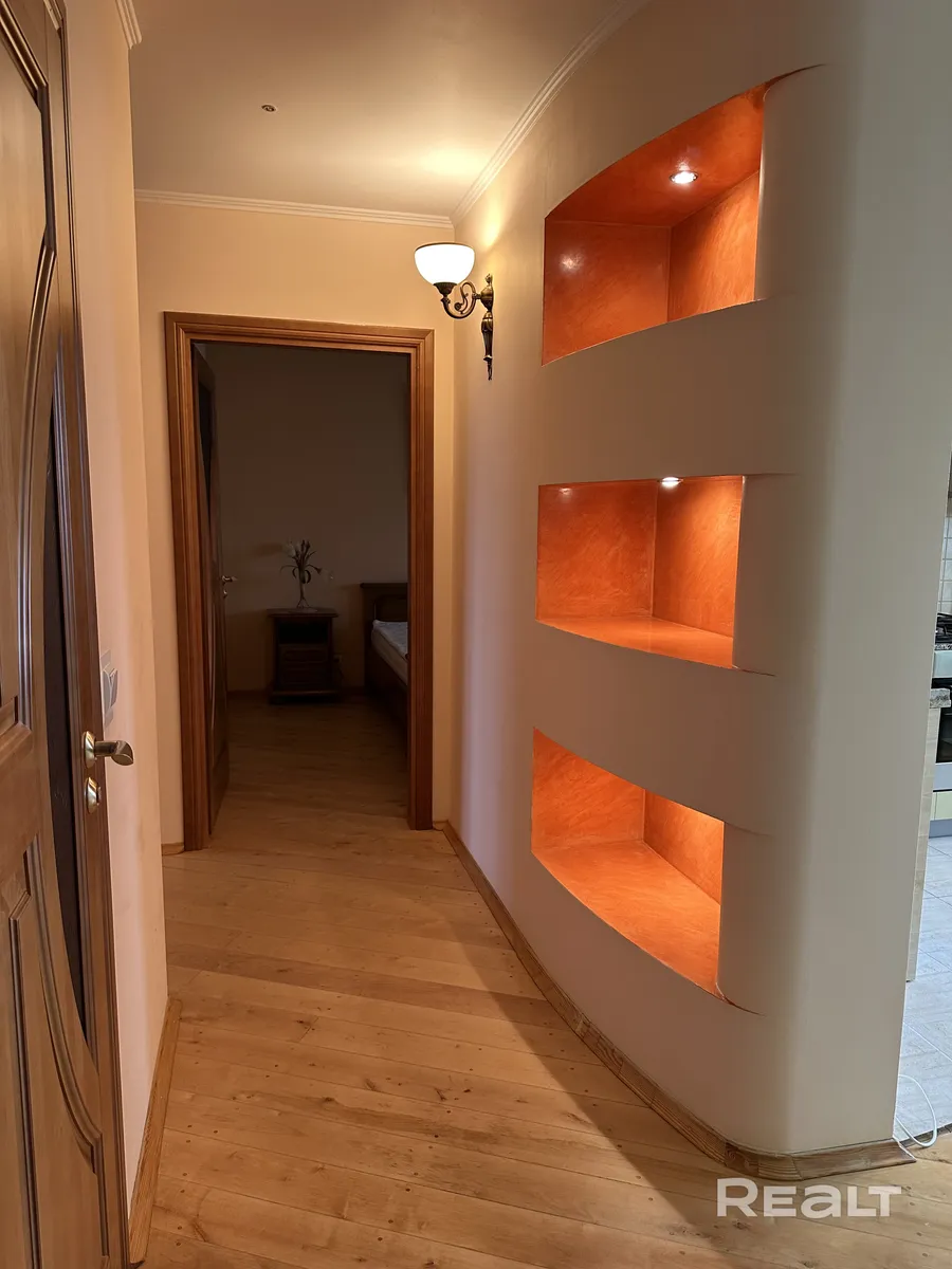 У калідоры ўбудаваны аб’ёмныя нішы-паліцы з падсветкай. Складана казаць пра іх функцыянальнасць, гэта хутчэй элемент дызайну ці выставачная прастора для прадметаў дэкору.