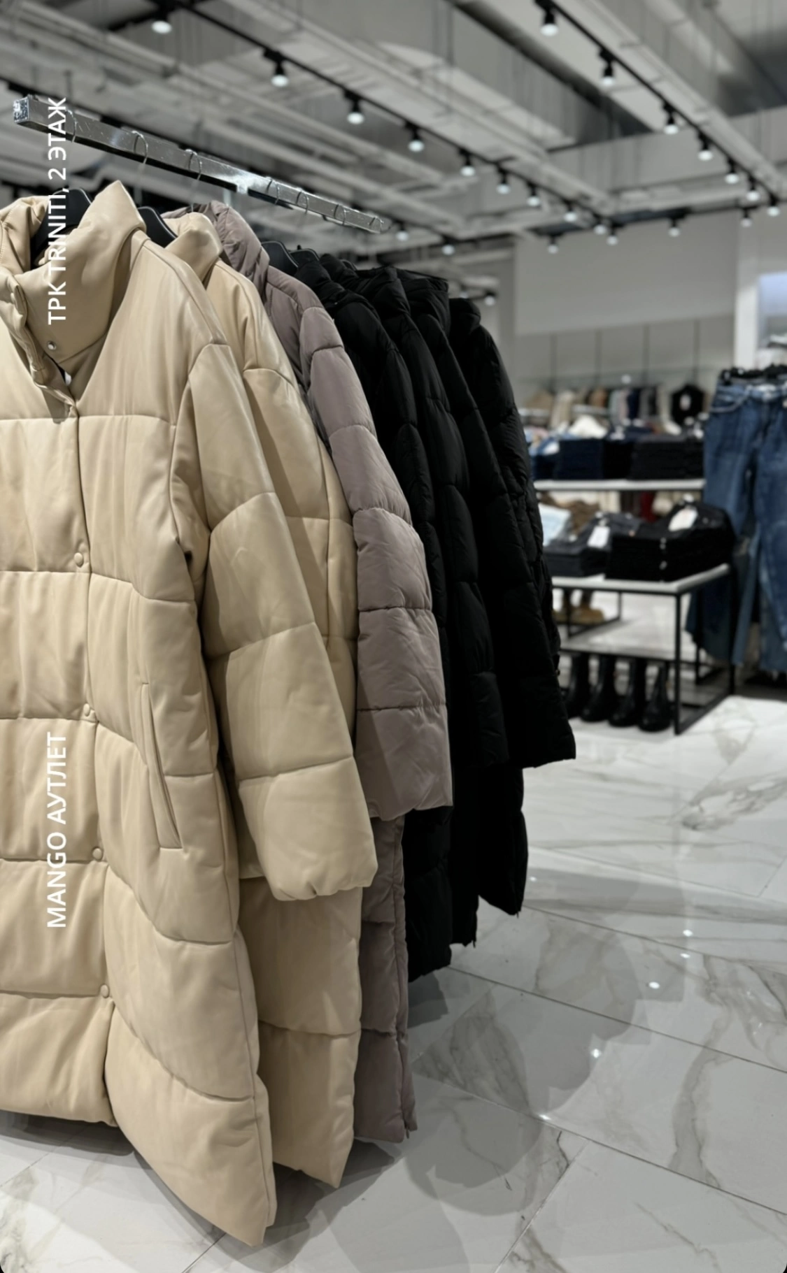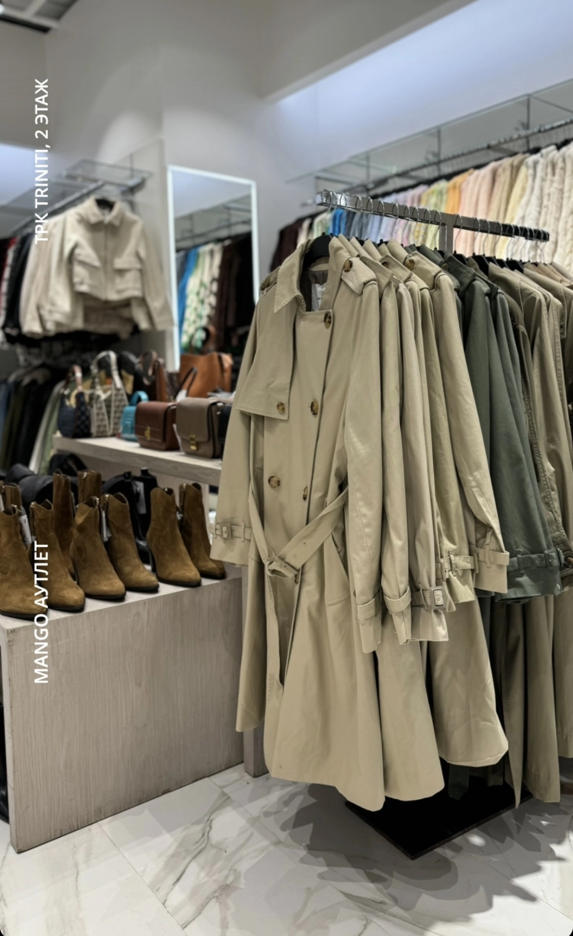 Пакуль у аўтлеце прадстаўлены жаночыя калекцыі мінулых сезонаў. Згодна з апублікаванымі ў Instagram Triniti сторыс, у асноўным у Mango зараз можна набыць восеньска-зімовае адзенне.