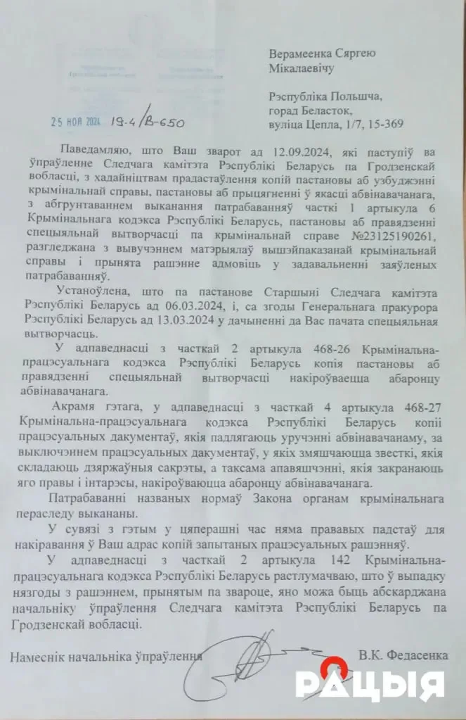 Актывіст з Гродна Сяргей Верамеенка некалькі месяцаў таму адправіў у СК просьбу азнаёміць яго з матэрыяламі спецвытворчасці – завочнай крымінальнай справы, якую распачалі ў дачыненні да яго, паведамляе “Гарадзенская праваабарона”.