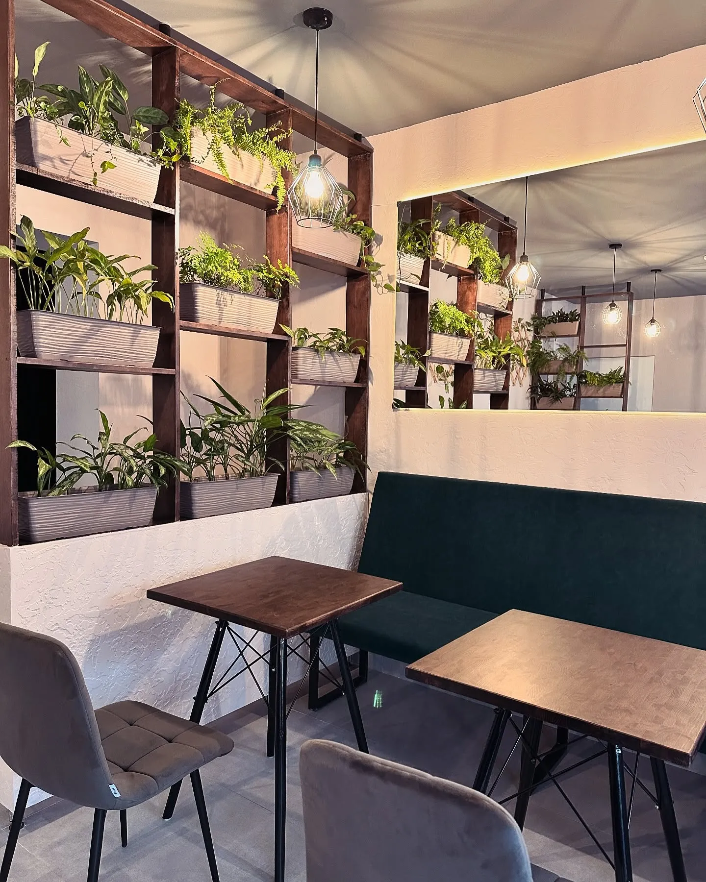 У кавярні светлы інтэр’ер ў спалучэнні з цёмным дрэвам, маленькія столікі, зеляніна на сценах і вялікае люстэрка.