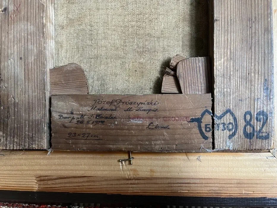 З адваротнага боку можна прачытаць, што карціну падарыў гродзенскаму музею 20 траўня 1924 года нейкі М. Талочка (M. Tołłoczko). Музей, створаны па ініцыятыве Юзафа Ядкоўскага, працаваў тады ў Гродне ўсяго два гады і яшчэ не паспеў пераехаць у Стары замак. Ён размяшчаўся ў комплексе будынкаў староства (цяпер – комплекс будынкаў за рэстаранам “Каралеўскае паляванне” і аблвыканкамам на вуліцы Ажэшкі). Сённяшні Гродзенскі гісторыка-археалагічны музей – прамы нашчадак міжваеннага музея Ядкоўскага.