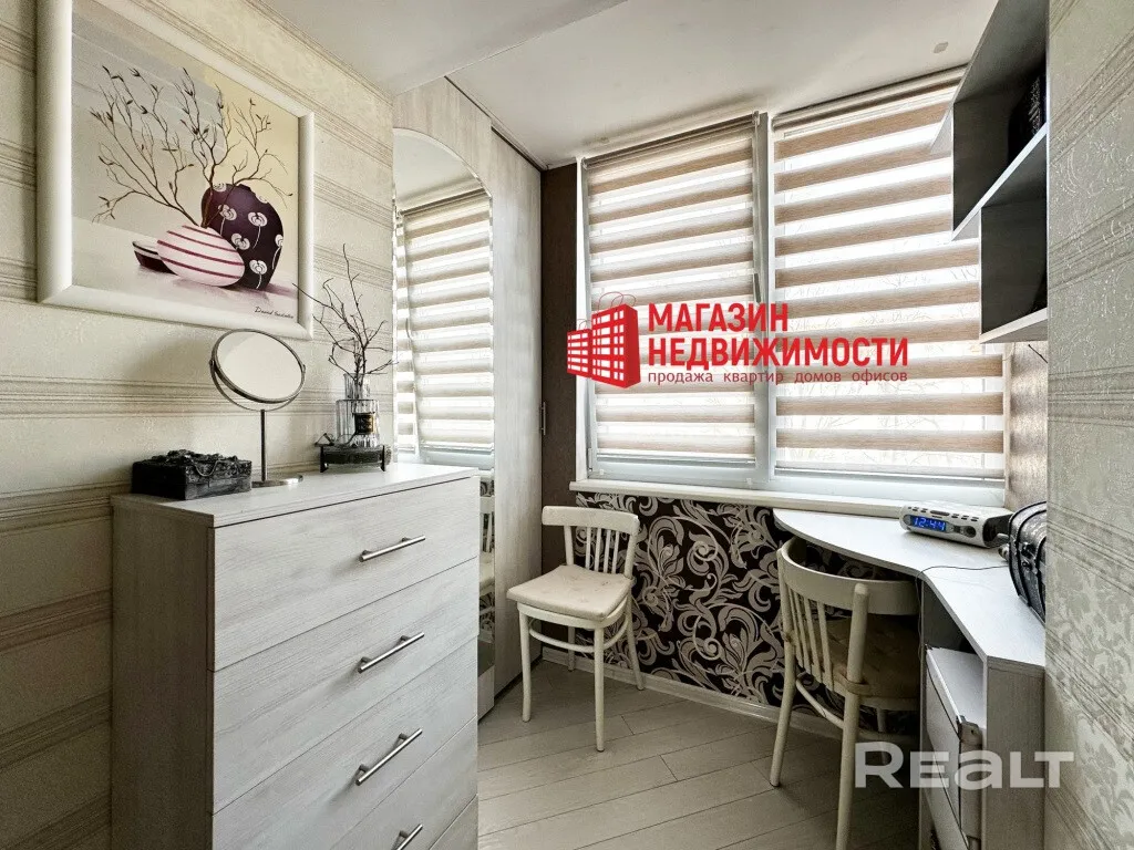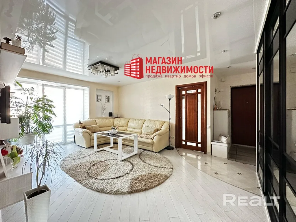 Кватэра размешчана на трэцім паверсе дзевяціпавярховага дома. Агульная плошча – 62,5 кв. м, з іх жылая – 36,4 кв. м. Кватэра светлая, з глянцавымі нацяжнымі столямі, якія яшчэ больш павялічваюць прастору. Ёсць дзве зашклёныя лоджыі, пераробленыя пад зону адпачынку, у зале – вокны да падлогі. Усталявана электрычная цёплая падлога, мэбля і тэхніка прадаюцца разам з кватэрай.