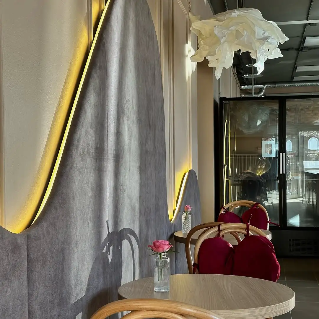 У кафэ больш за дзясятак пасадачных месцаў. Інтэр’ер выкананы ў светлых адценнях з акцэнтам на папяровых люстрах-“воблачках”.
