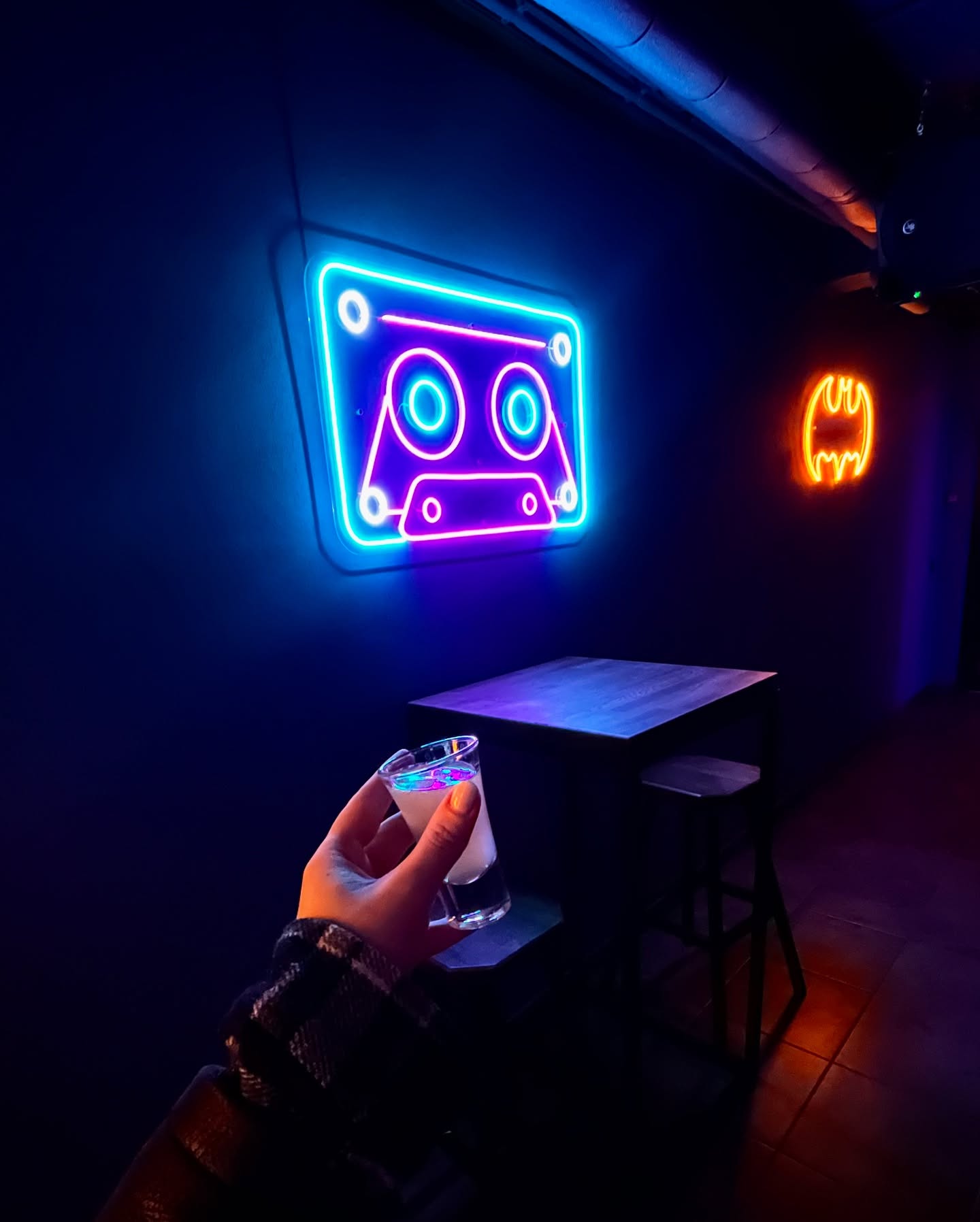 Уладальнікі апісалі інтэр’ер: неон, плакаты з кумірамі 90-х і барная стойка з настойкамі «як з дзяцінства». На відэа з установы відаць аўтэнтычны дыван, неонавыя цытаты з «Брат 2» і тую самую прыстаўку. Граць будуць хіты 90-х і 00-х.