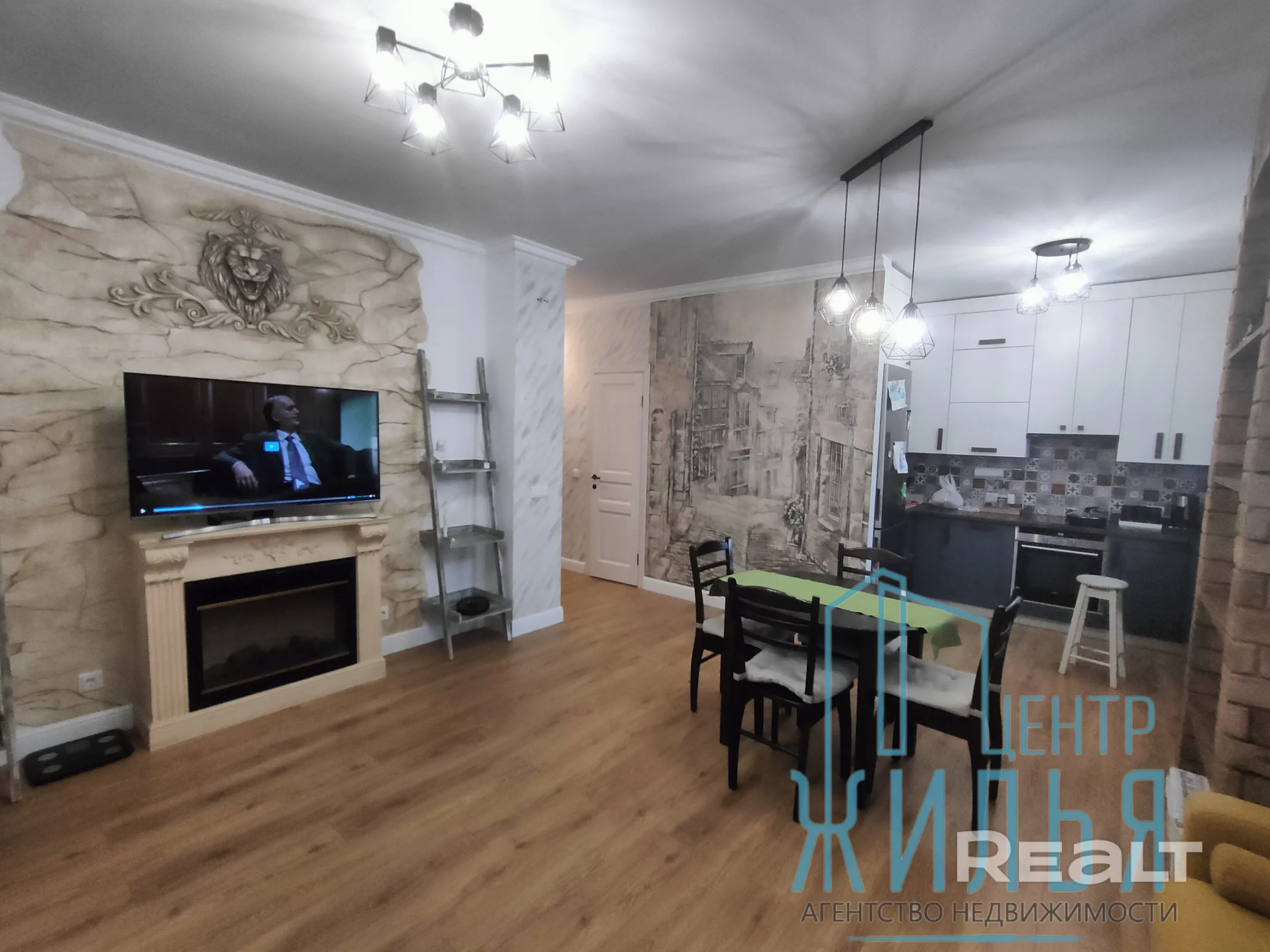 Кватэра з рамонтам у стылі лофт. Прастора аб’яднанай кухні і гасцінай аформлена дэкаратыўнай цэглай і ляпнінай, распрацаванай беларускай мастачкай, на сцяне – стыльны малюнак. У гэтай зоне усталяваны дэкаратыўны камін. Асвятленне рэгулюецца: на кухні — дзве люстры і кропкавыя свяцільні. Спальня і дзіцячы пакой выкананы ў спакойных адценнях, сцены абклееныя шпалерамі.