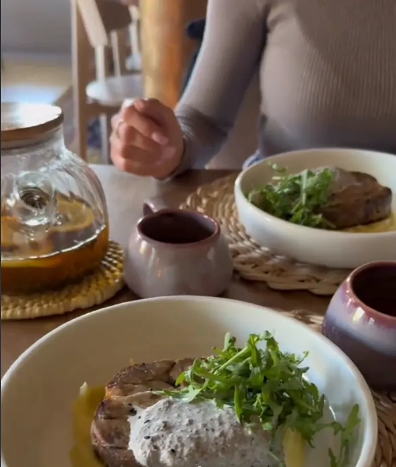 На абед яны абралі кафэ “Дзюна” – ежа каштавала 80 руб. Аляксандра пахваліла інтэр’ер, меню і памер порцый. Пасля дзяўчаты схадзілі ў Фарны касцёл і краму сувеніраў “Лёля”, праўда, там купілі толькі паштоўку і яе цану не агучылі.