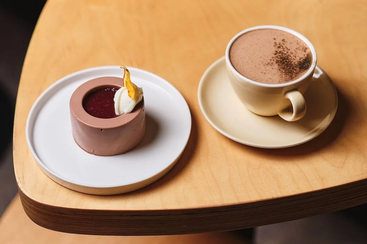 У кавярні на Дамініканскай, 3 зробяць шакаладны мока з дабаўленнем узбітых вяршкоў. Сэт дапоўняць тарталеткай з цытрынавай карамеллю, бісквітам і мусам.