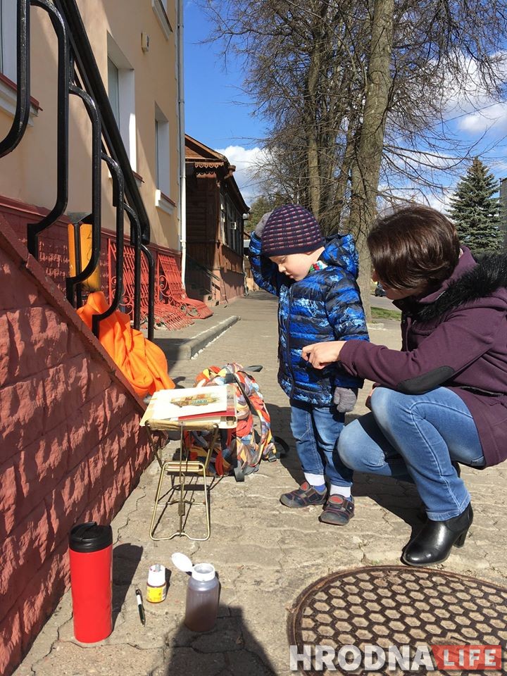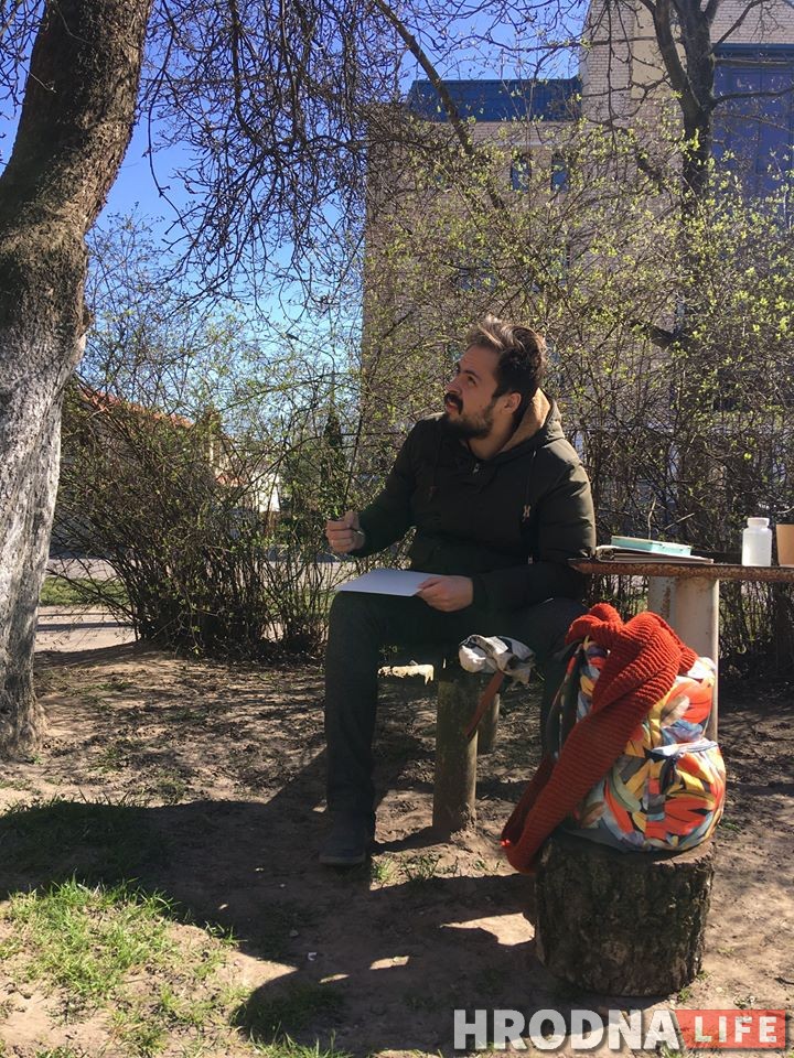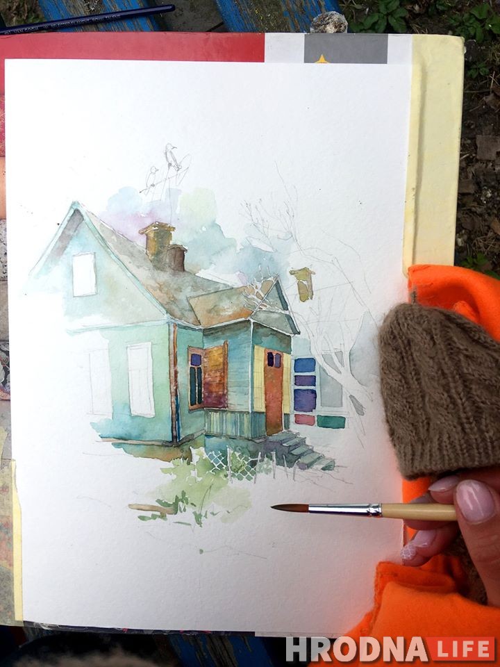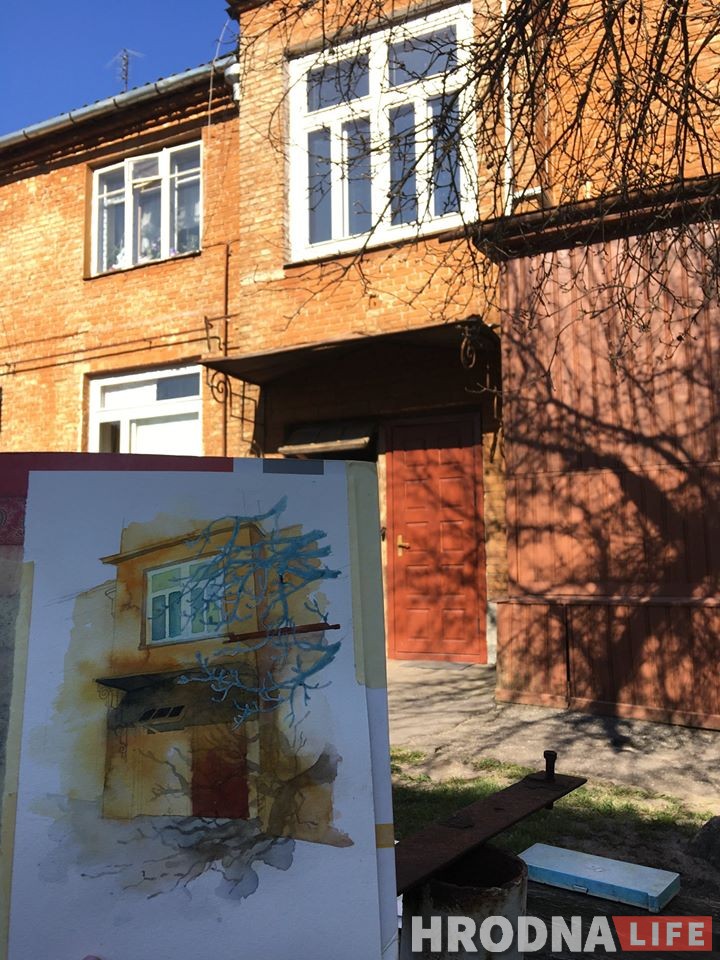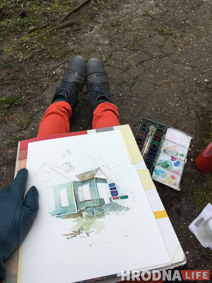 Пераадолець вясновую непагоду Владзе дапамагаюць рукавіцы і кемлівасць: “На маім учорашнім месцы моцна дзьме, то хаваюся за рог дома. Малюю часткова па памяці, толькі часам вызіраю з-за вугла, каб зверыцца. У рукавіцах маляваць не асабліва зручна – пастаянна размазваецца акварэль, адно паспявай выціраць. Затое гэта цікава. Нібы такая гульня – паспей, пакуль не засохла”.
